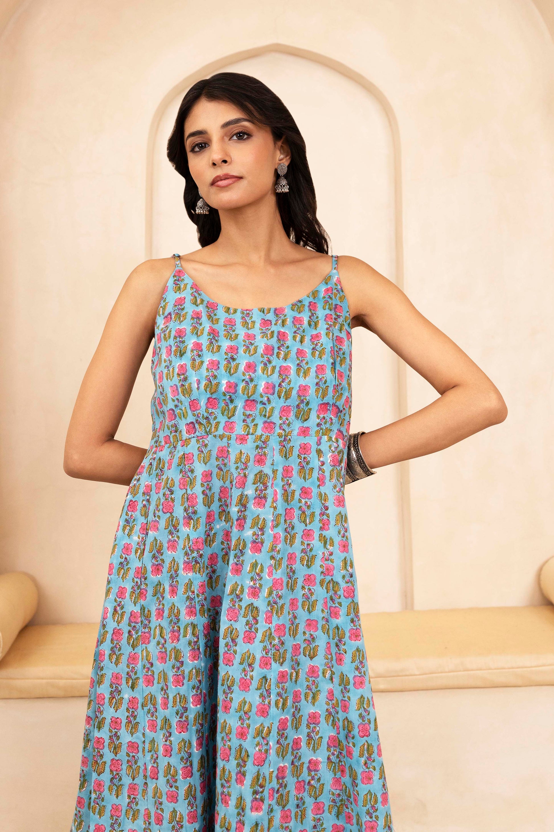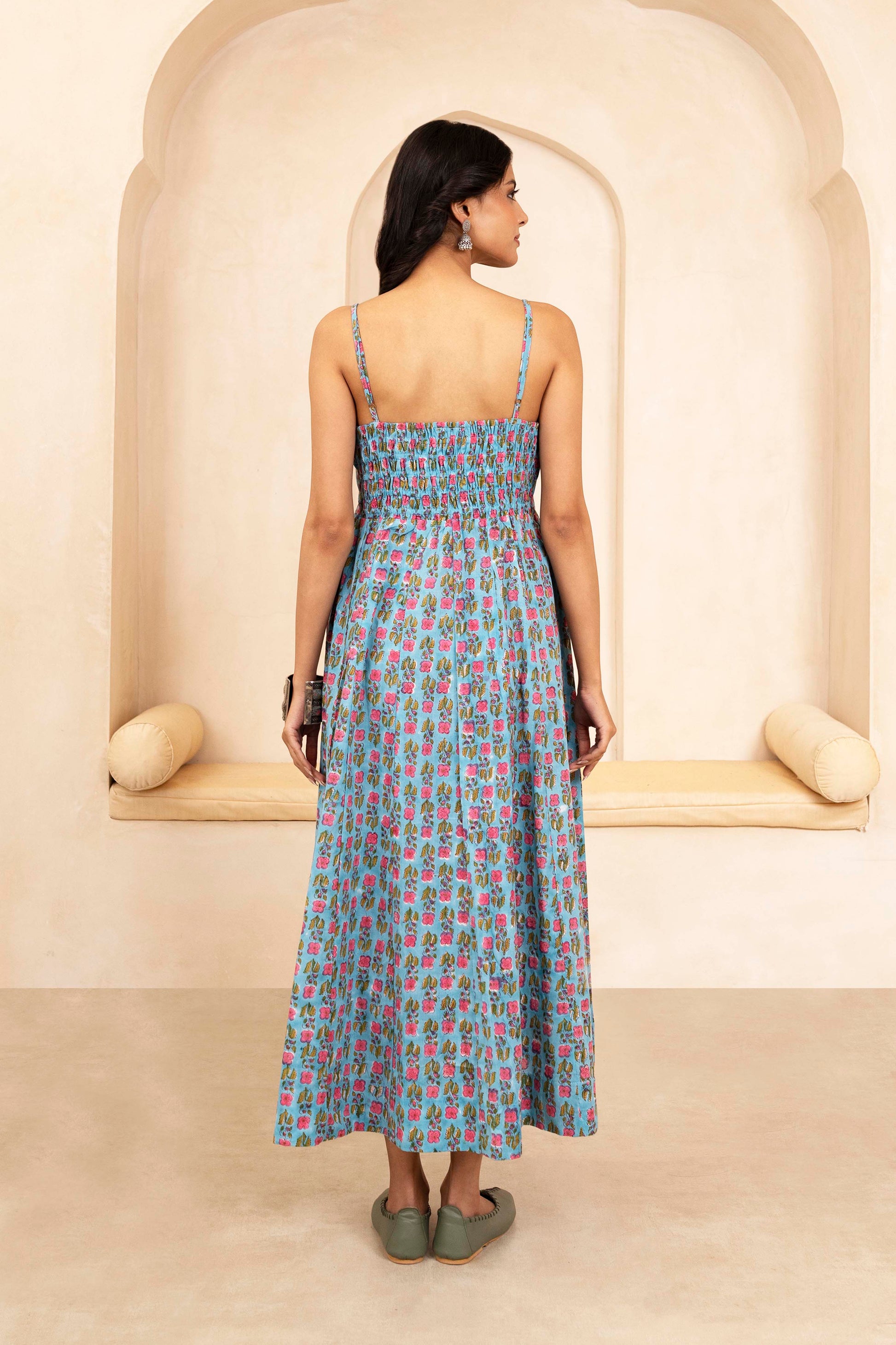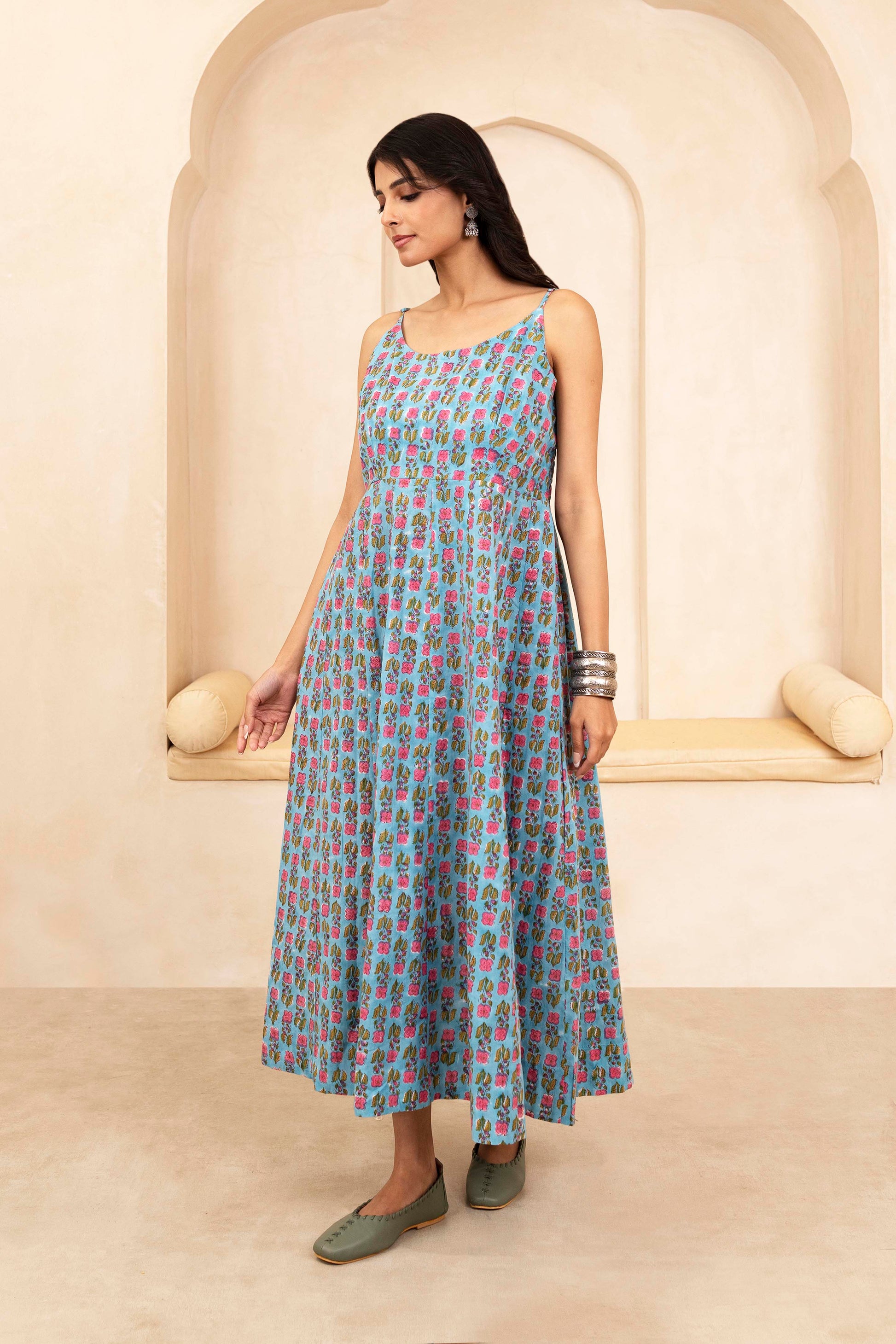 This spaghetti strap dress features a hand-block floral print in pink and green, on a blue fabric. It has a midi length, falling below the knee. The dress is sleeveless with thin straps, and the fabric appears to be a lightweight cotton.It is a casual, summery style suitable for warm weather. The dress is a comfortable and breathable option for everyday wear.