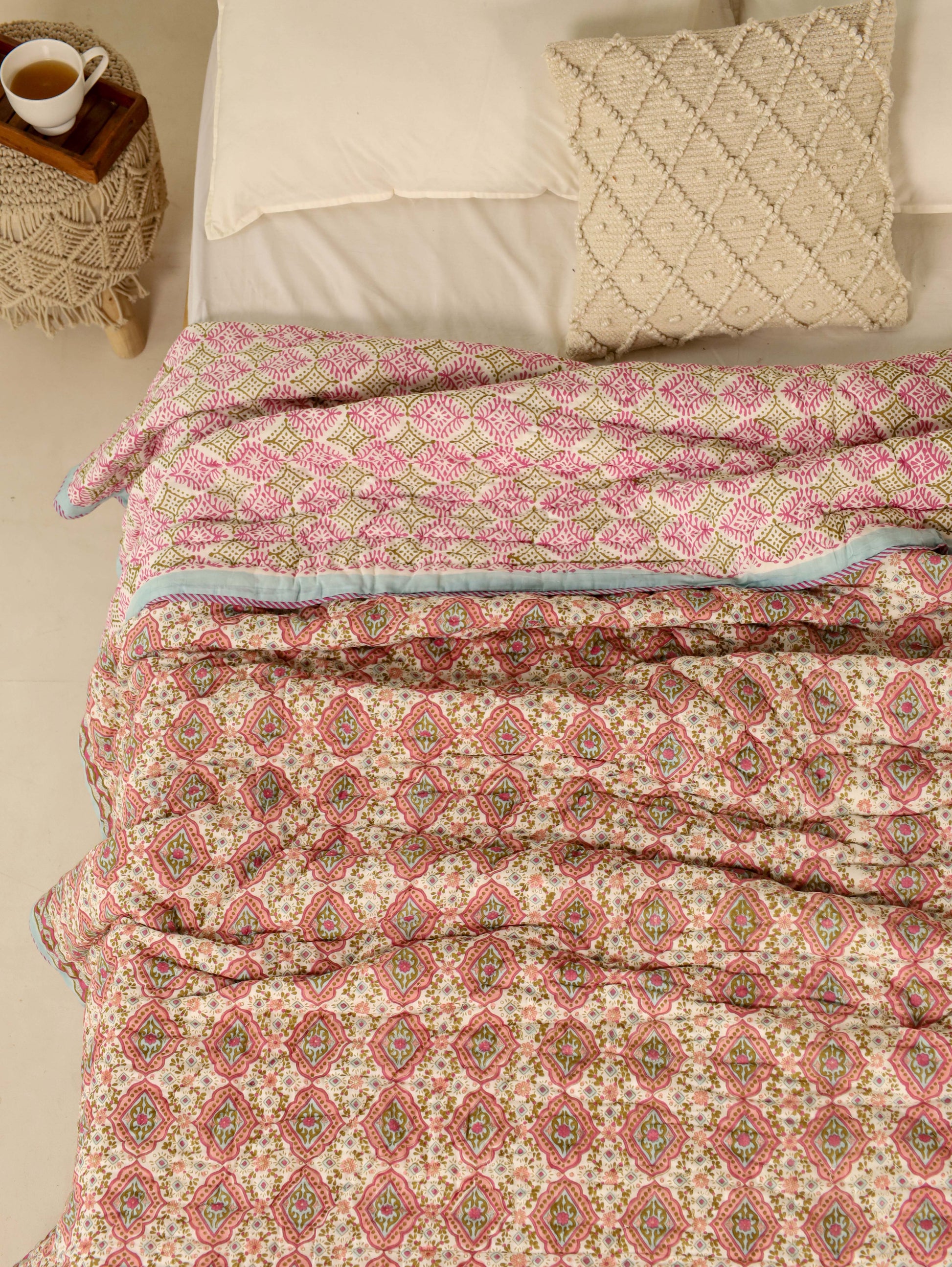 Shuddhi is introducing Reversable Quilted Bed Razai that can be easily used on both sides and are typically made by stitching together layers of fabric with a layer of cotton sheet in between, creating a quilted pattern. They add both warmth and visual appeal to a bed. |