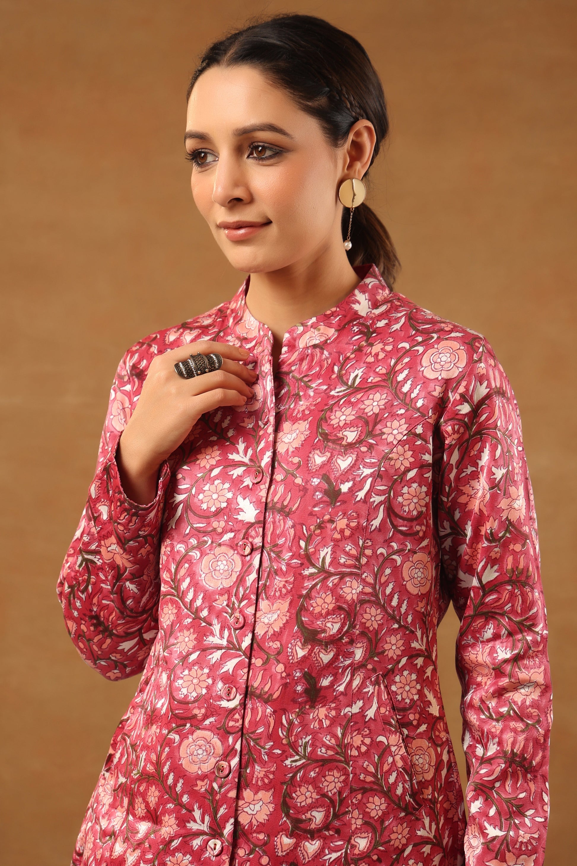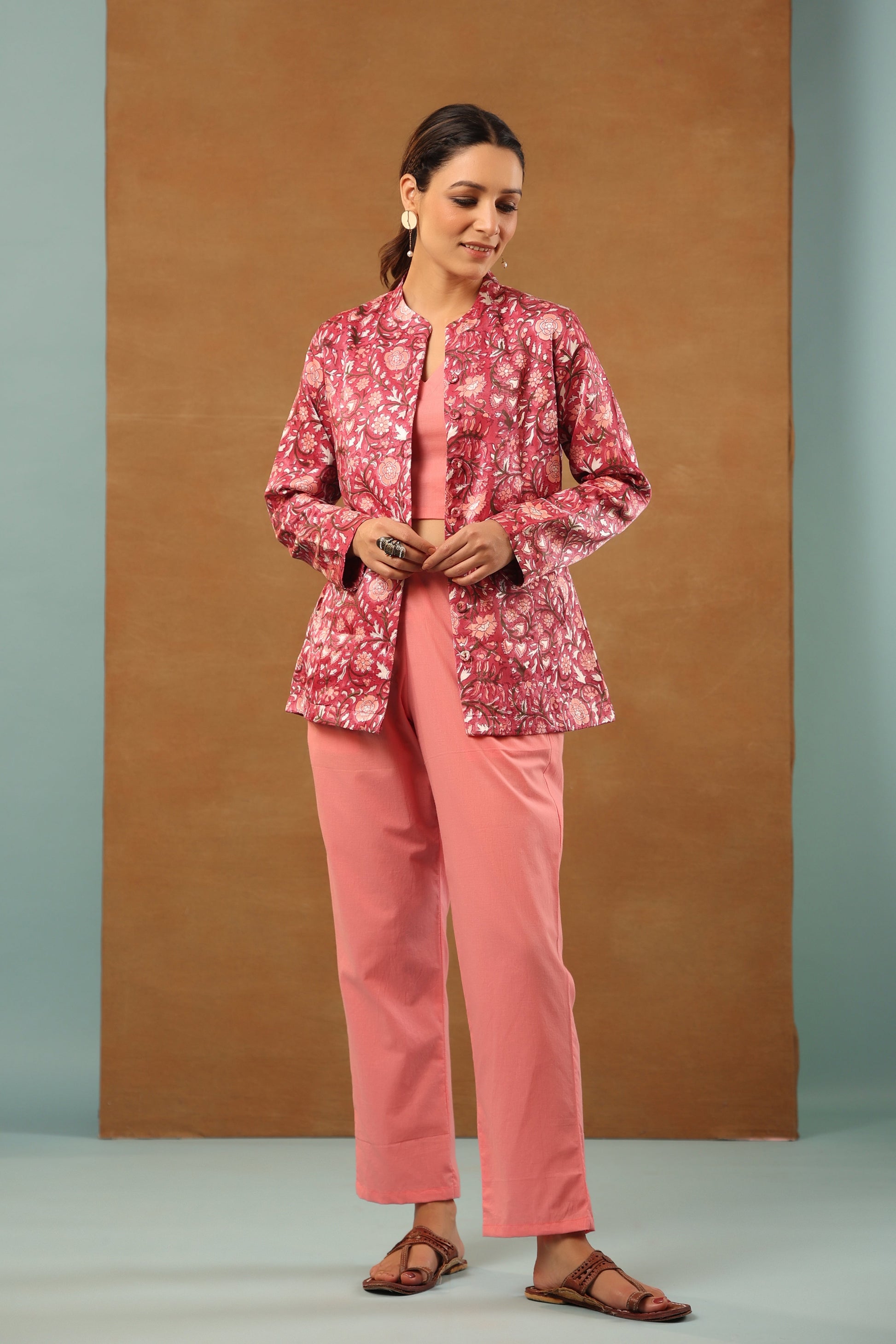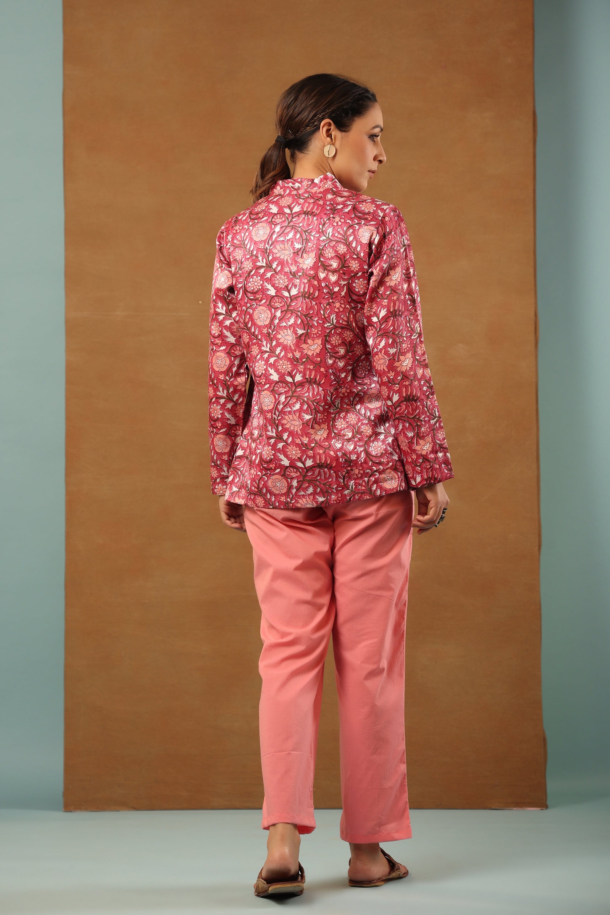 Our classic Rouge pink with the combination of green and white floral mashru silk short jacket comes with a combination of apricot orange and white floral handblock printed. Mashru is a woven cloth that is blend of silk and cotton to keep it light and warm. Pair it with silk saree or pants, perfect for any occasion.