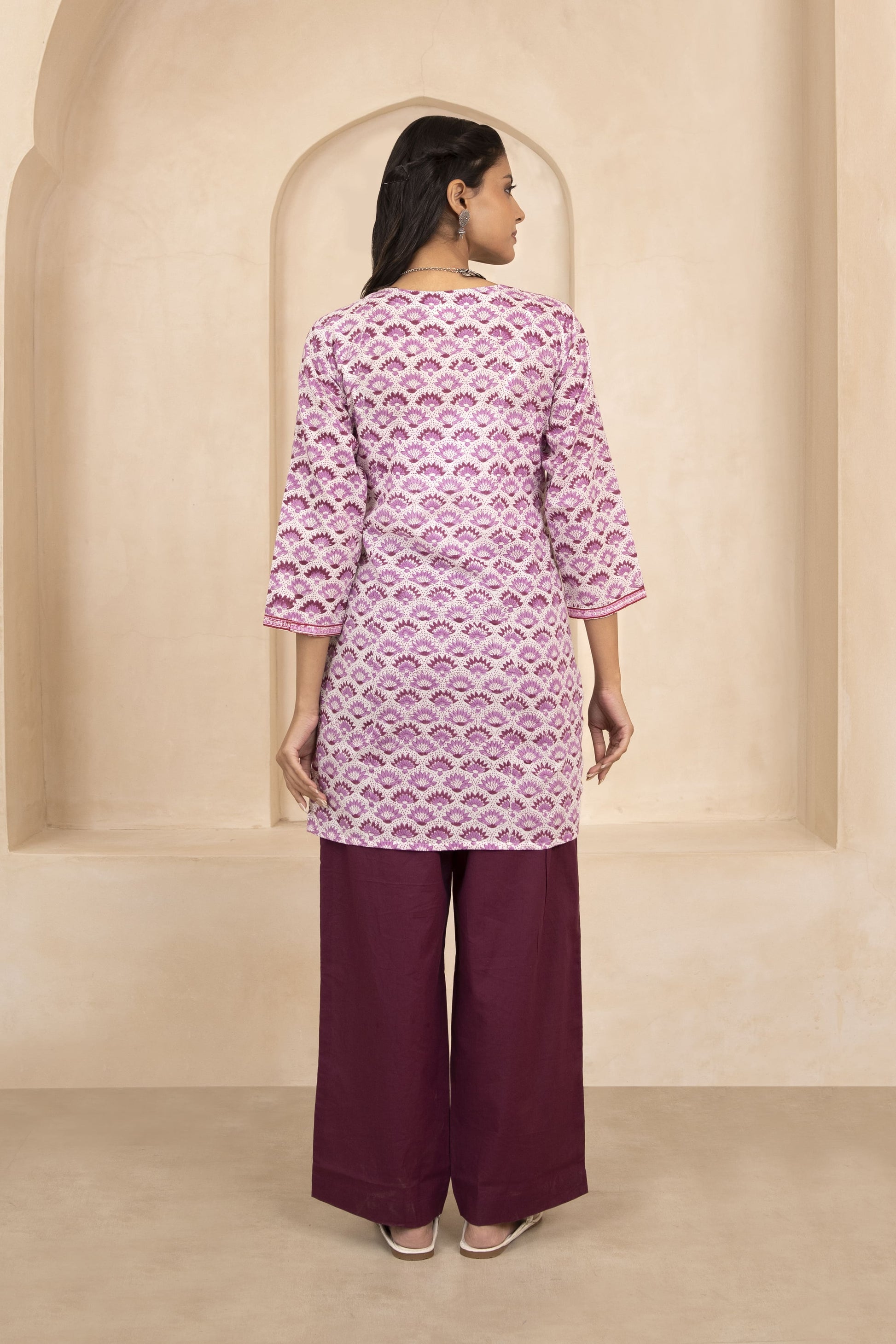 White handblock printed cotton Short Kurta with floral lotus motifs with shades of purple and a decorative neckline panel. Soft, breathable, and ideal for daily comfort with a touch of elegance.