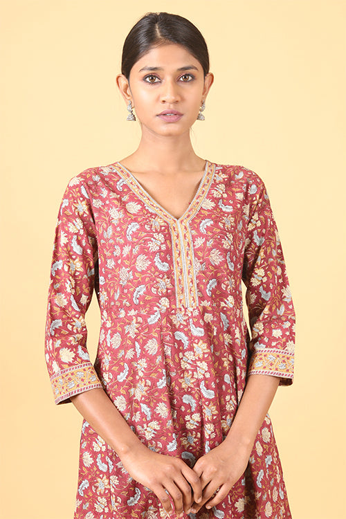A timeless cotton hand block printed Amber Red with a combination Ice Blue floral Anarkali kurta accented with sequin detailing on the yoke comes with a side pocket. A comfortable design crafted for summer in superior quality cotton fabric.