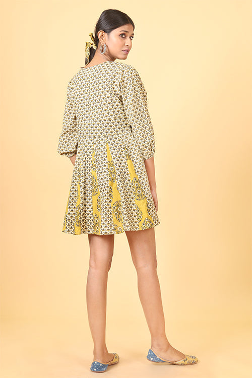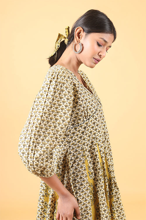 Beige and canary yellow buta Handblock Printed Dress with 3/4 puffed sleeves. A comfortable design crafted for summer in superior quality cotton fabric.