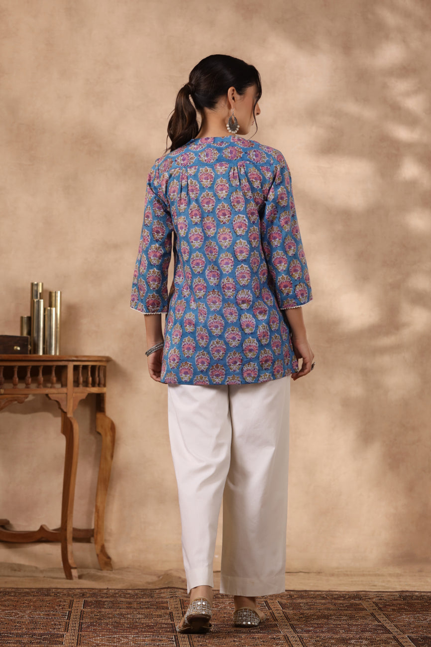 Our classic blue, yellow and pink color top with a combination of blue top. This blue top with white buttons, pin tucks on the yoke finishing with white lace on the sleeves.