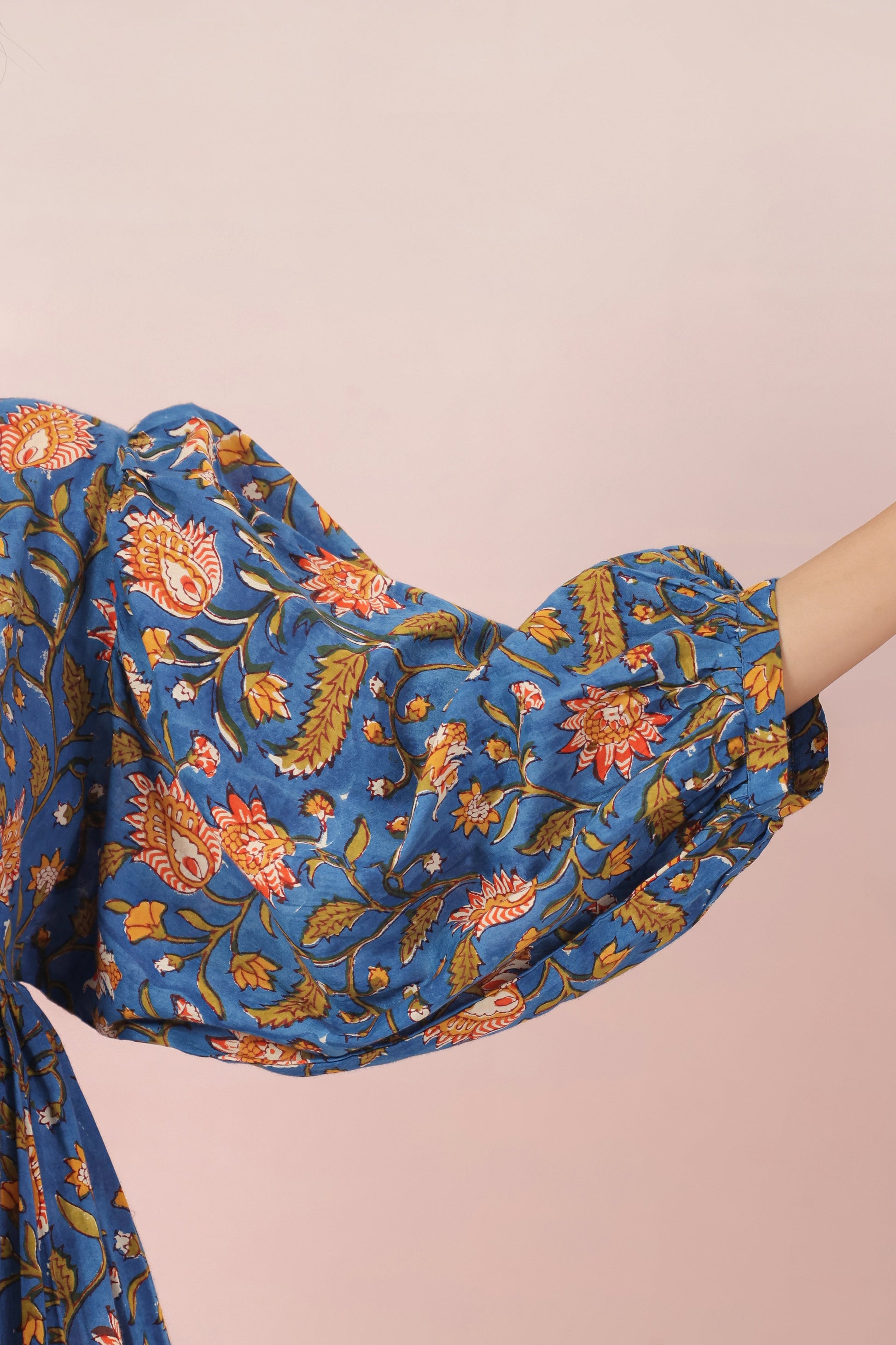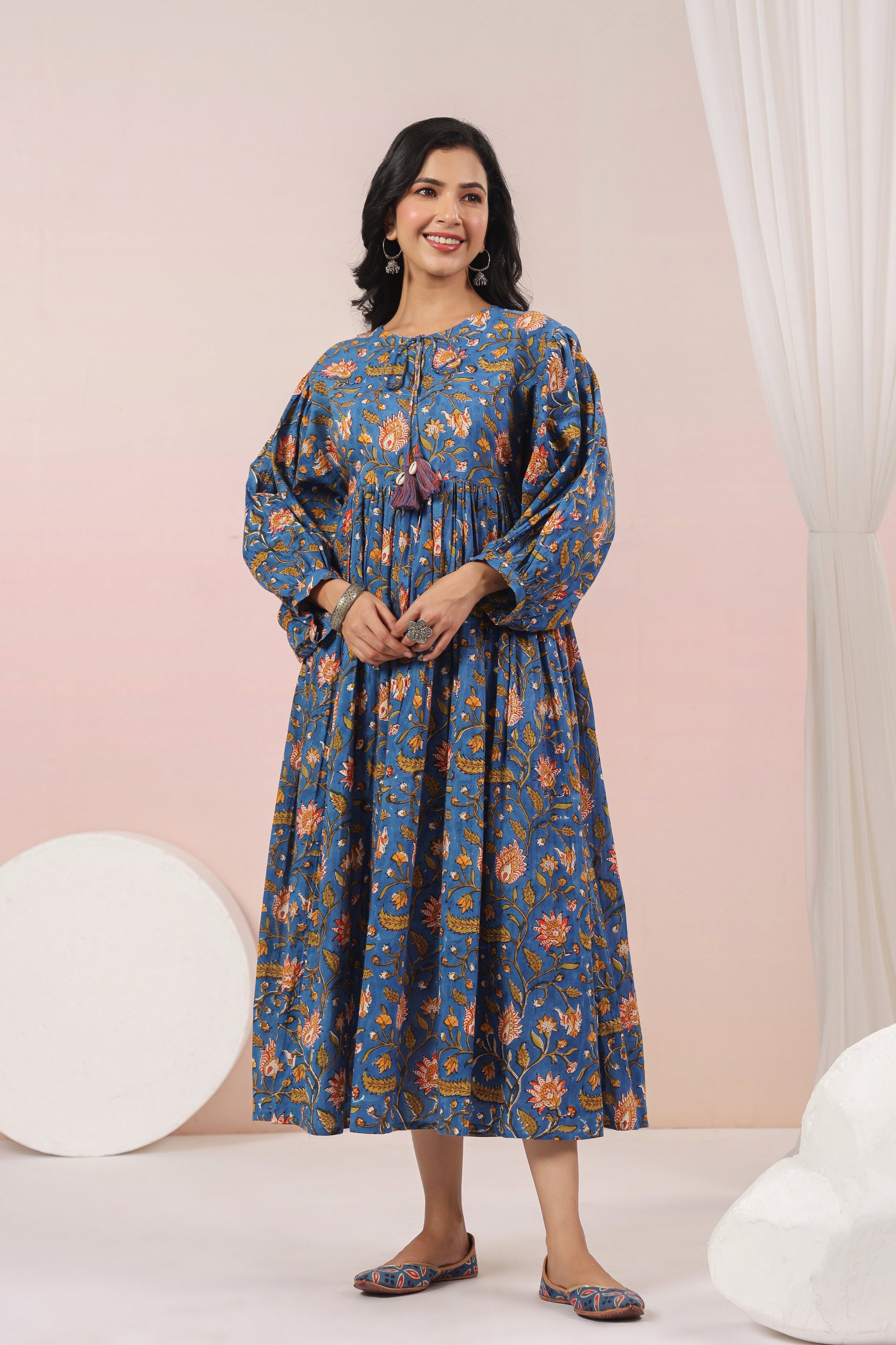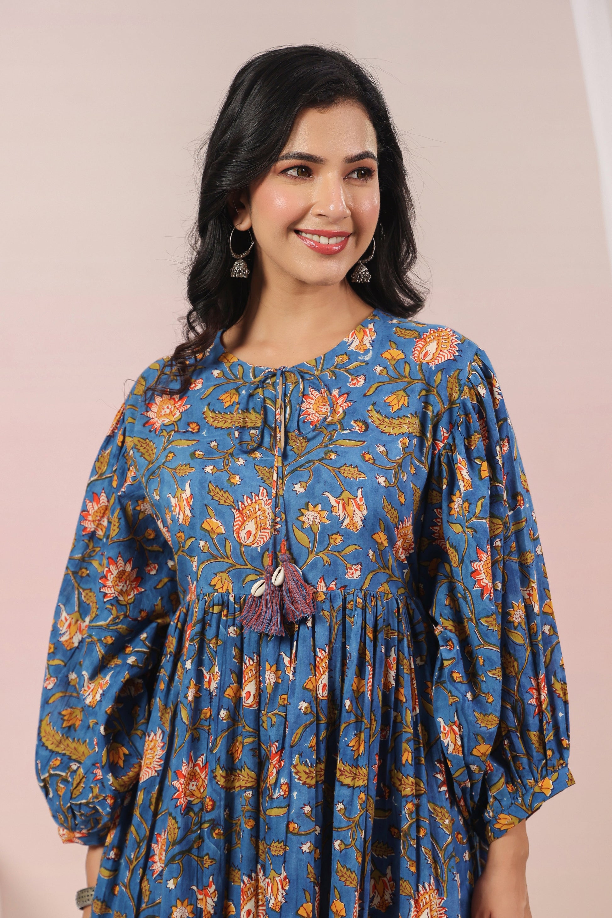 step into effortless bohemian elegance with this captivating blue handblock dress, a perfect blend of artisanal craftsmanship and free-spirited style. The dress features a serene blue base, providing a striking backdrop for the intricate handblock floral motifs that adorn the fabric. The floral patterns are adorned with a vibrant mix of orange, yellow, and green accents. The warm orange and sunny yellow bring lively pops of color, while the refreshing green adds a touch of natural vibrancy, creating a harmonious and eye-catching design that embodies bohemian charm.