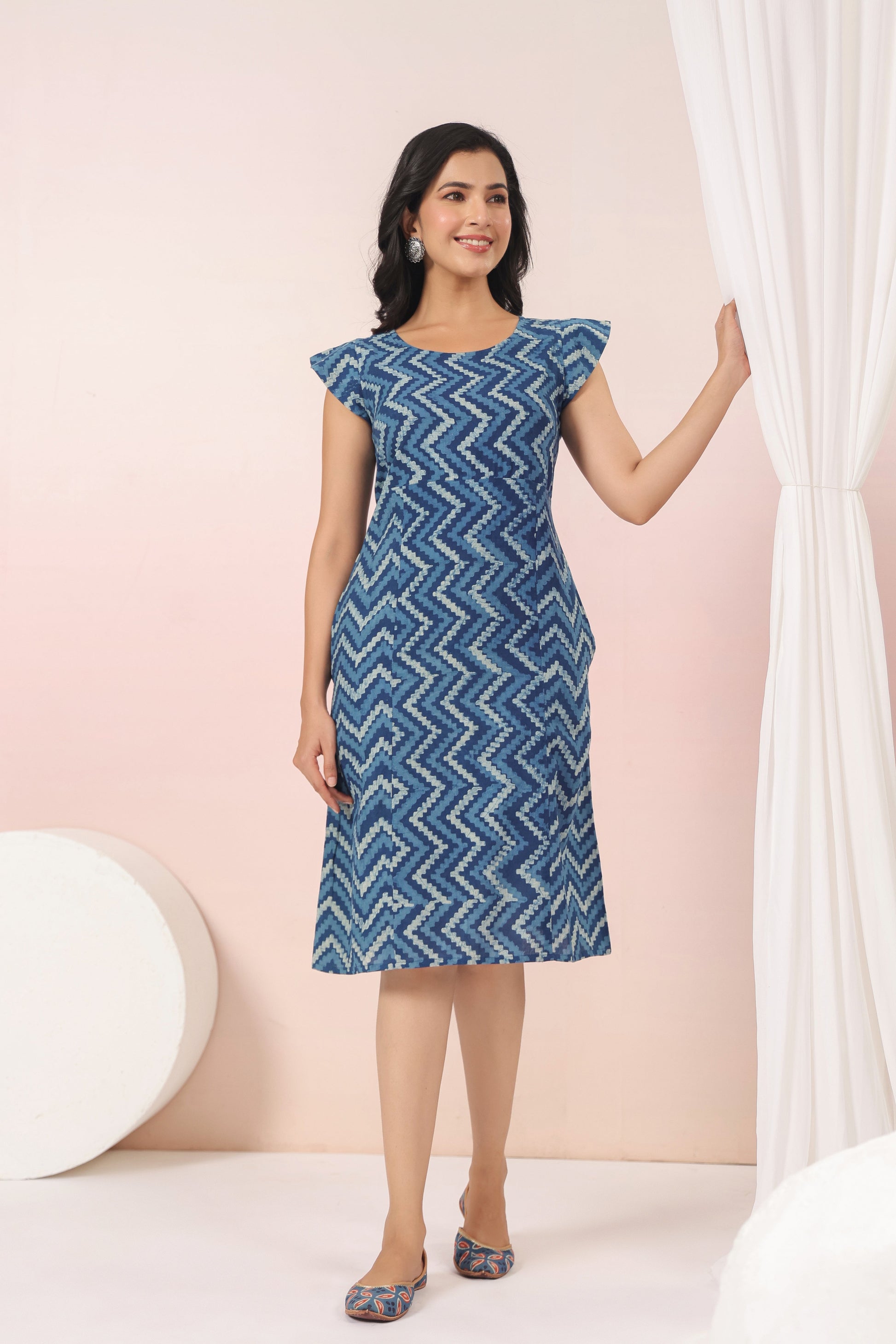 Step into a world of modern elegance with this blue handblock short dress, a striking piece that masterfully blends traditional craftsmanship with contemporary design. The dress is adorned with a captivating zigzag pattern, featuring both horizontal and vertical lines that create a dynamic, geometric visual effect.The handblock printing technique brings out the intricate details of the pattern, with varying shades of blue woven throughout.