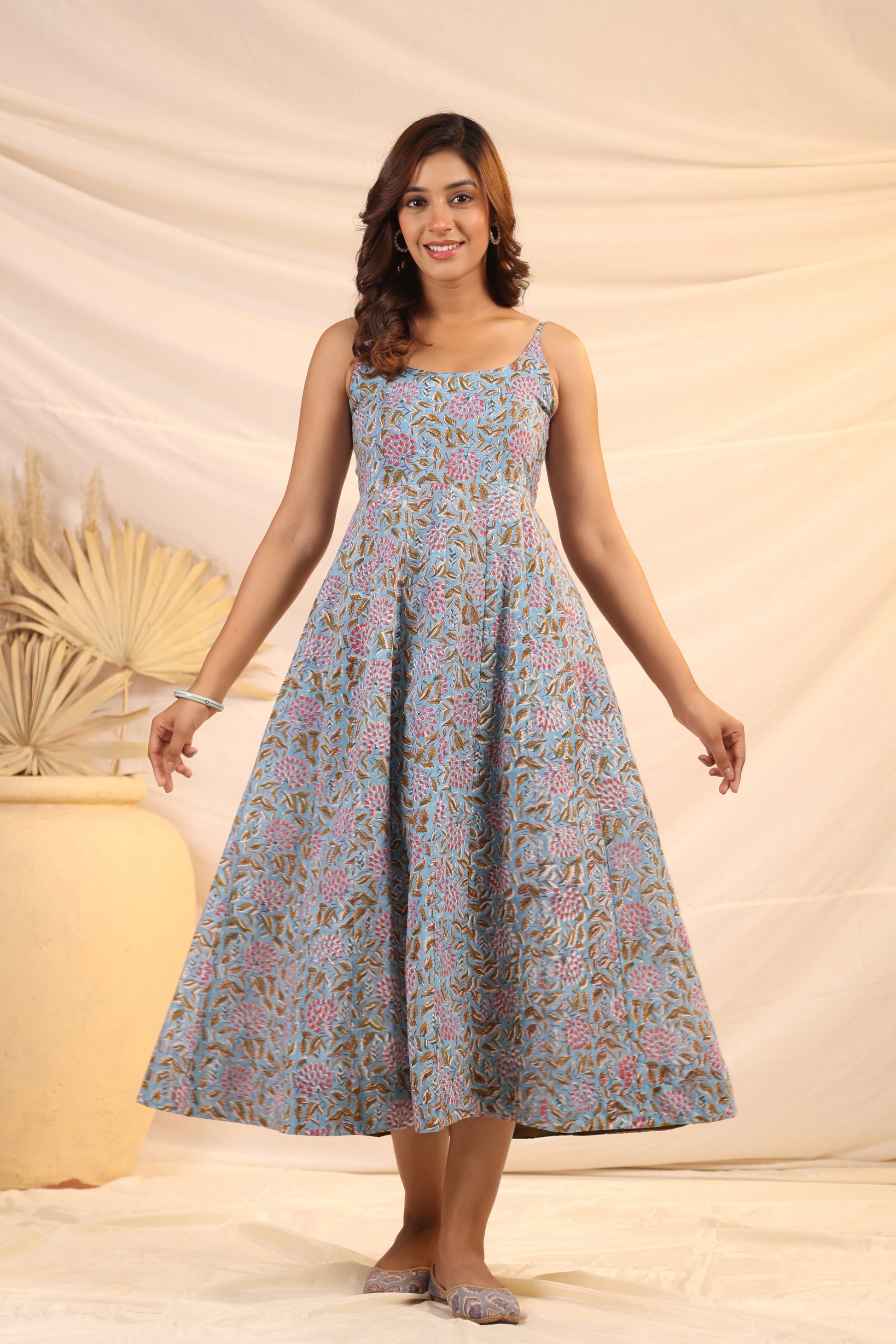 Embrace effortless charm and artisanal elegance with this handblock blue spaghetti dress, a beautiful fusion of vibrant design and traditional craftsmanship. The dress features a serene blue base, which provides a stunning backdrop for the intricate Handblock floral motifs that adorn the fabric. Delicate floral patterns are meticulously printed across the dress, showcasing a harmonious blend of red, blue, and green accents. The rich red flowers add a touch of warmth and vibrancy, while the subtle blue and green elements enhance the floral design with refreshing depth and contrast.