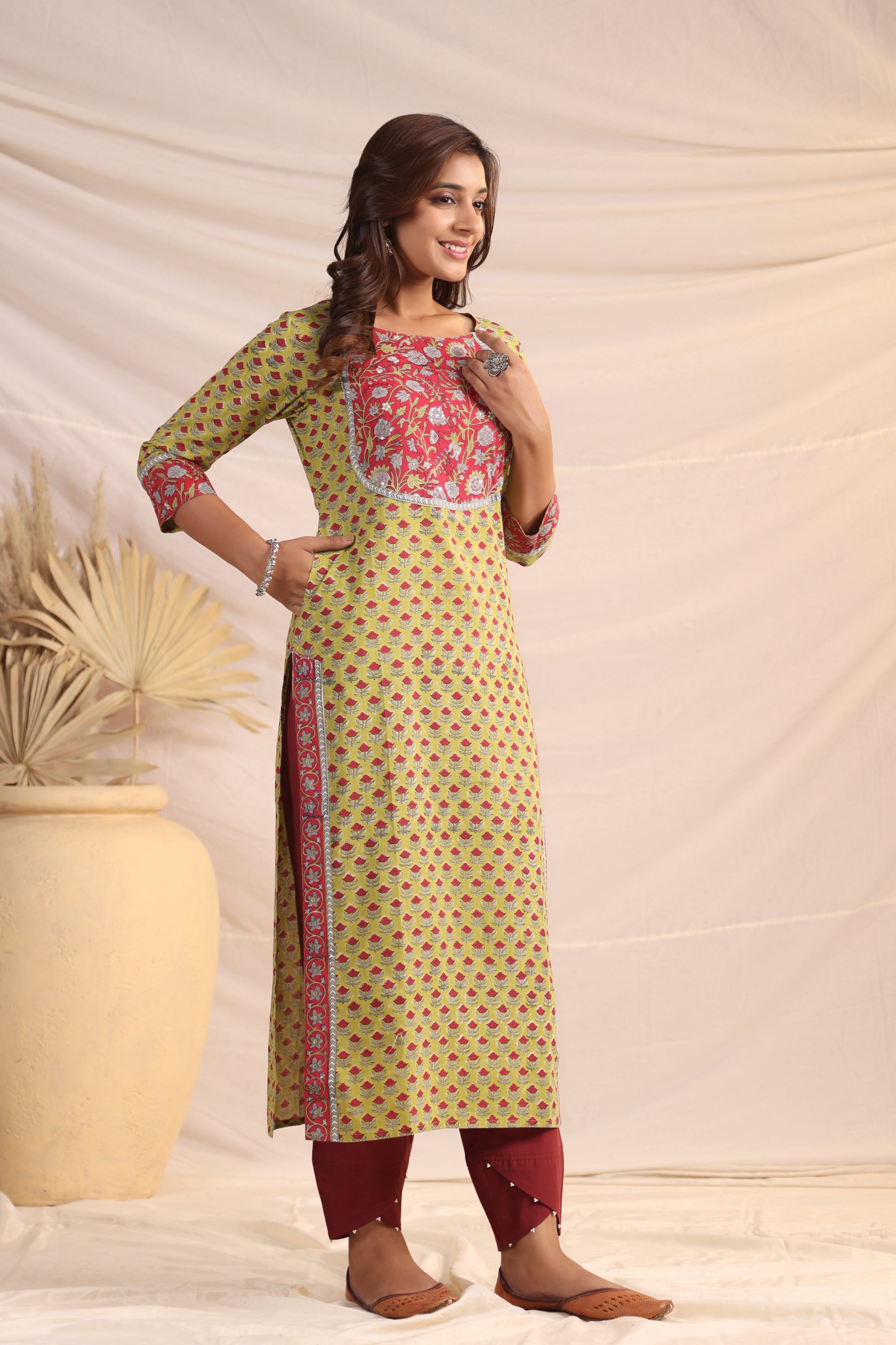 The Green and Pink kurta features a vibrant color palette that beautifully blends tradition with contemporary style. Its flattering silhouette enhances the figure, while intricate patterns and detailing add a touch of elegance. Perfect for festive occasions or casual outings, this kurta is a versatile addition to any wardrobe. The soft fabric ensures comfort, making it a go-to choice for all-day wear.