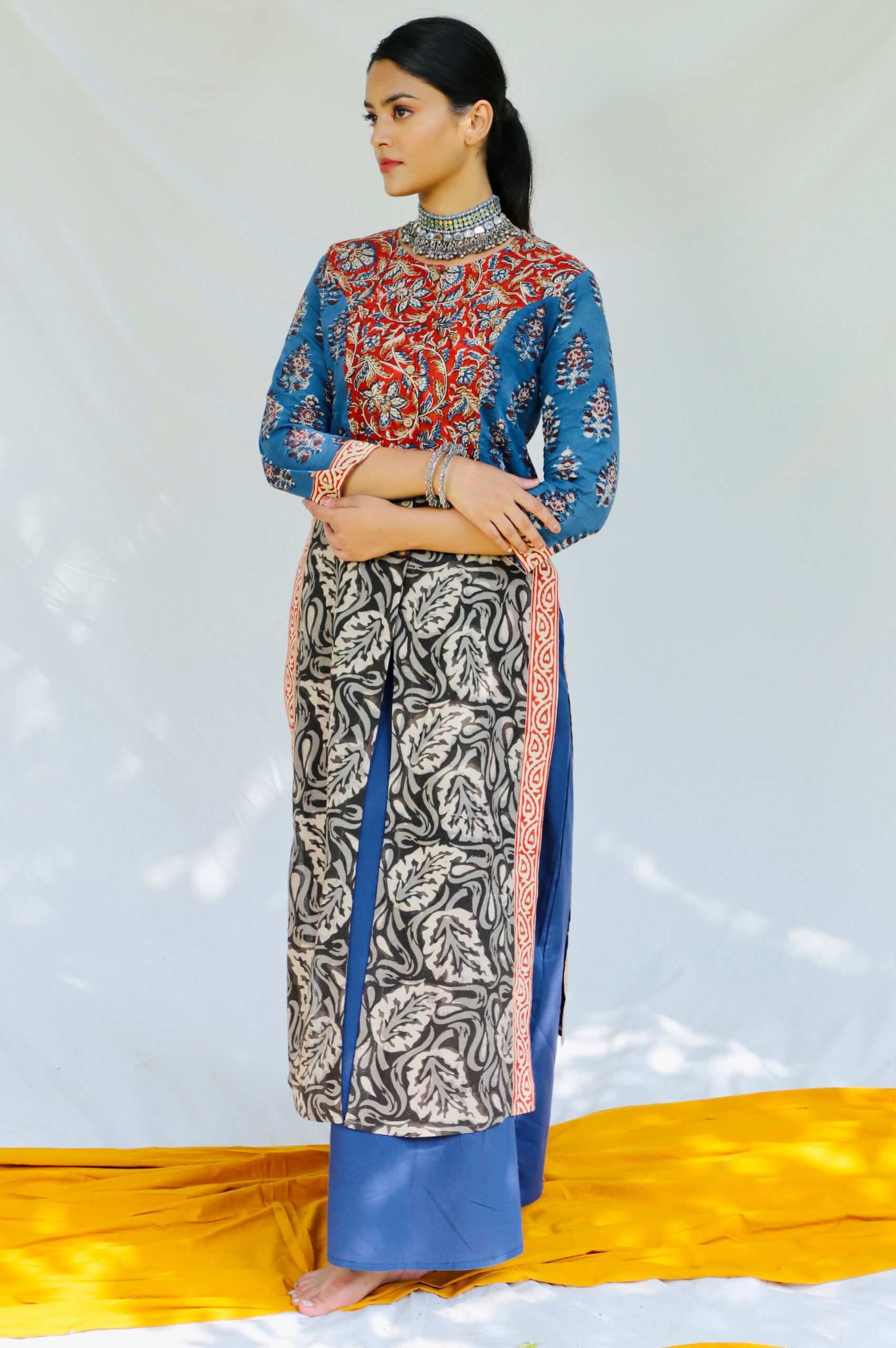 Handblock printed Indigo and kalamkari dress with double inner and outer. A perfect piece for occasion with side pockets comfort. Made from Soft cotton fabric. Pair it with Jutti and Kohalapuri.