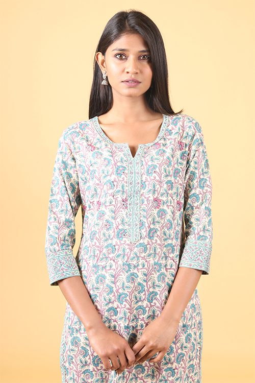 Shuddhi Macron White with Teal Geen Handblock Printed Kurta