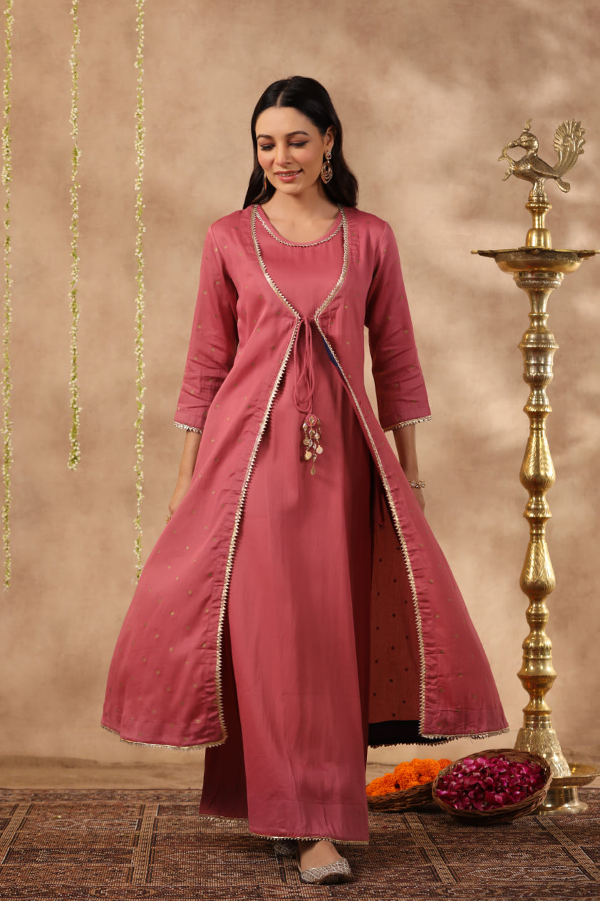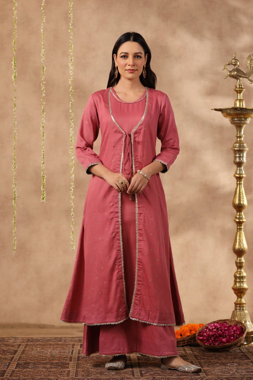 Our classic mauve color double dress comes with a single color . This double dress comes with decent amount of gota patti work.