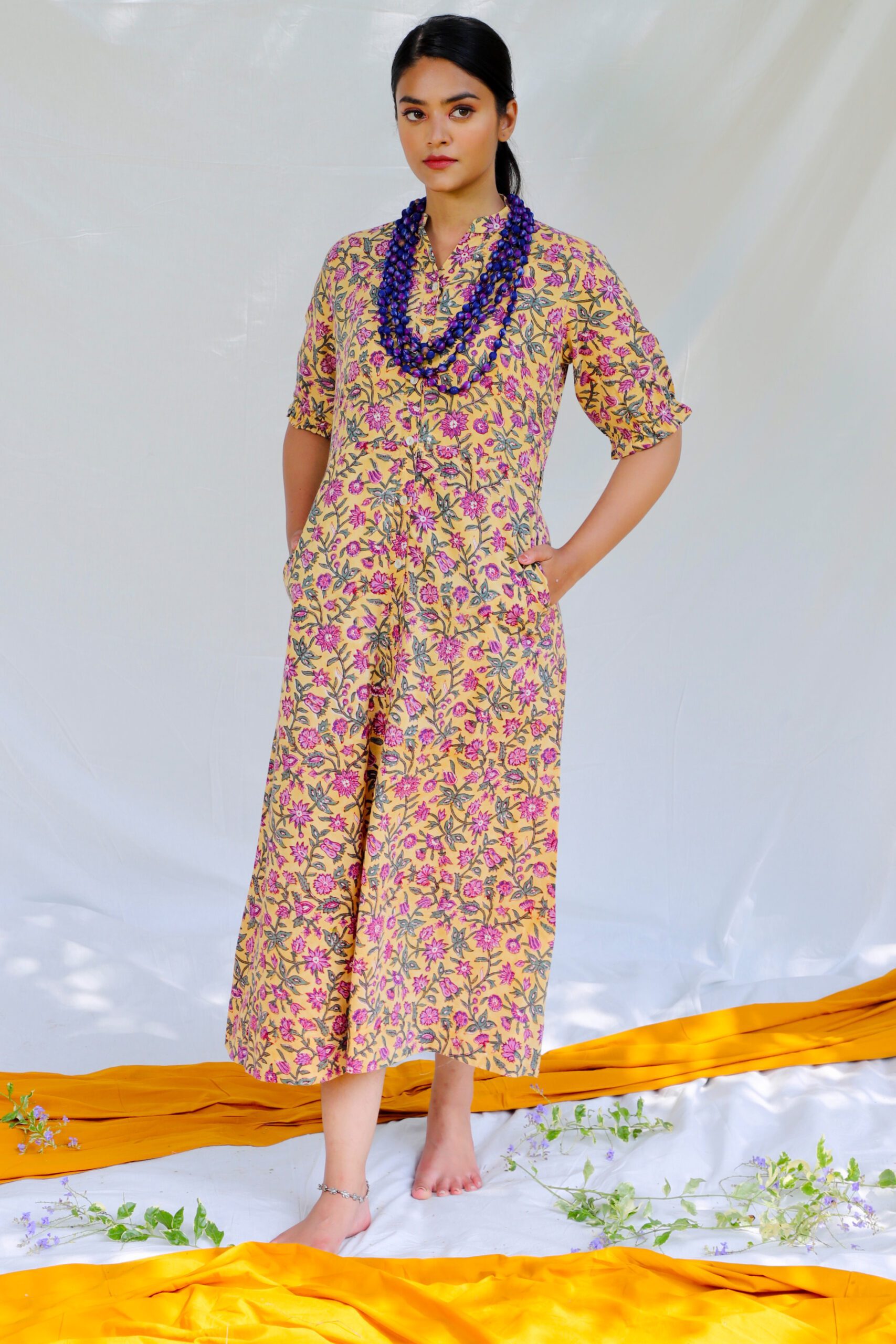 Handblock printed Mustard and Violet soft cotton dress with side pockets for more comforts. A perfect day out dress, paired with jutti or flats for a perfect look.