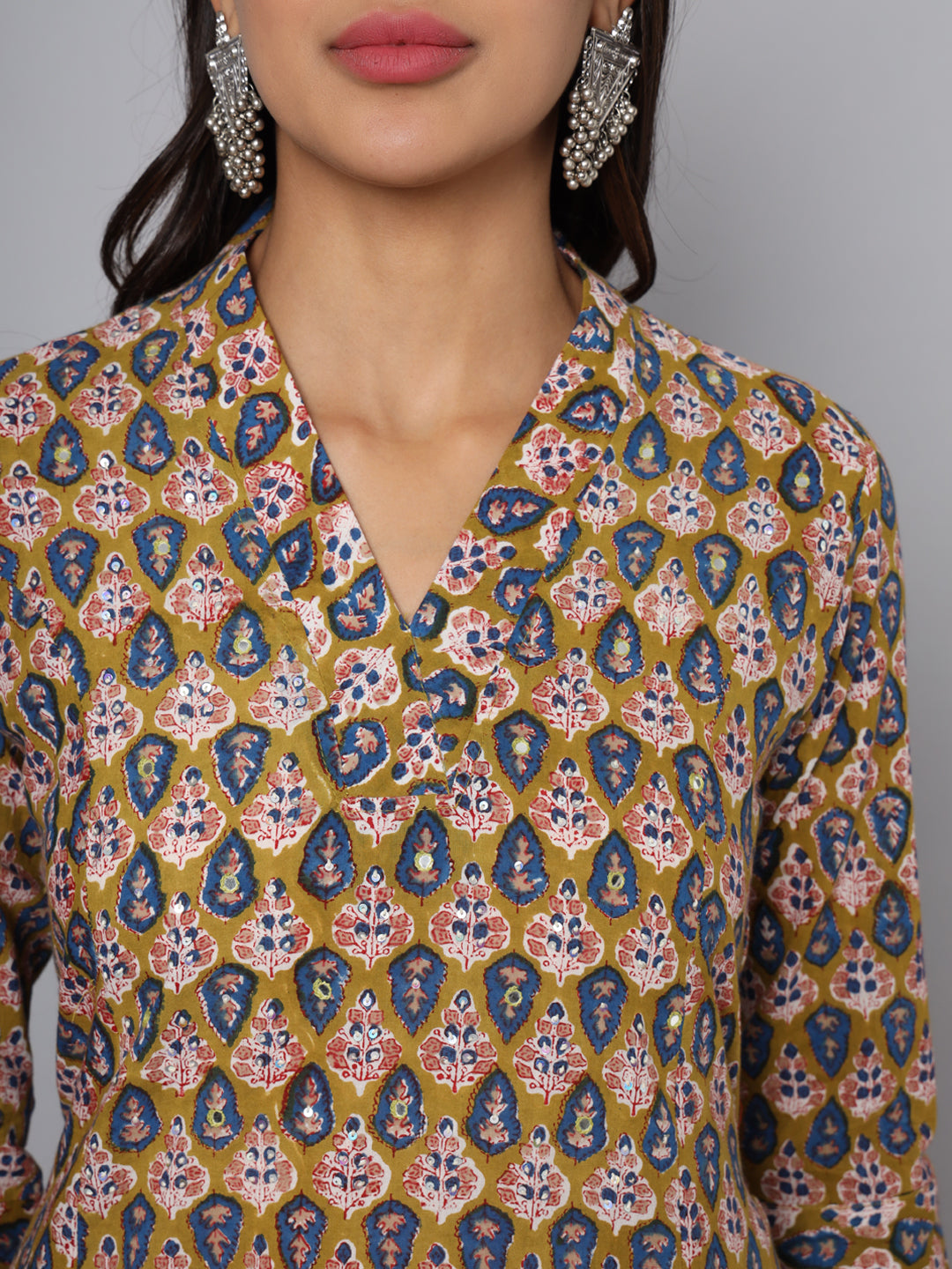 Crafted from High quality hand block printed cotton fabric. This Kurta and pant set gives you perfect chick look with comfortable clothing for casual and office wear. Paired with Shoes or jutties will compliment the look.