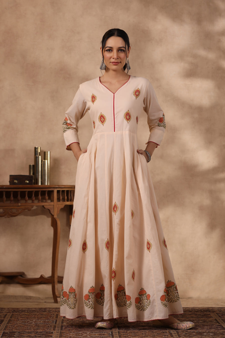 Our classic peach and orange long dress comes with combination of orange yellow and yellow. This long anarkali dress with pieping and print placement comes with 3/4th sleeves and comes with work on yoke.