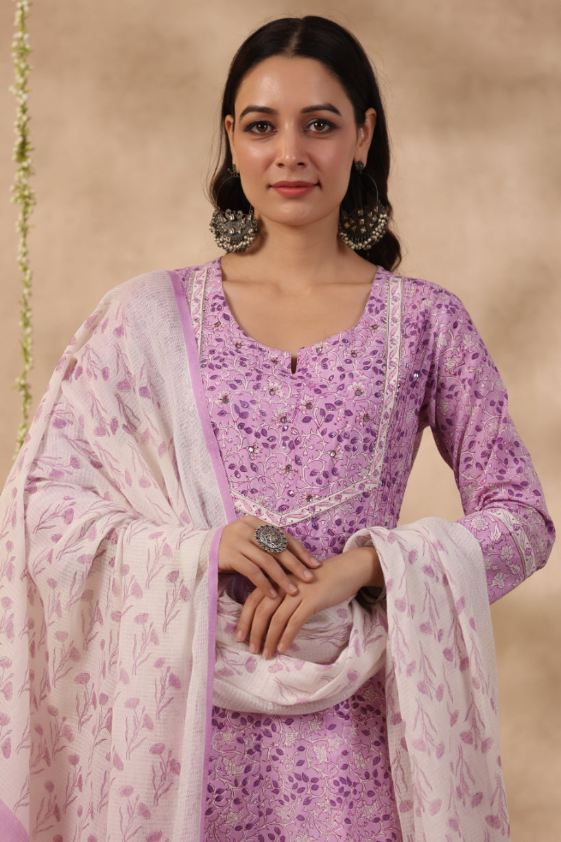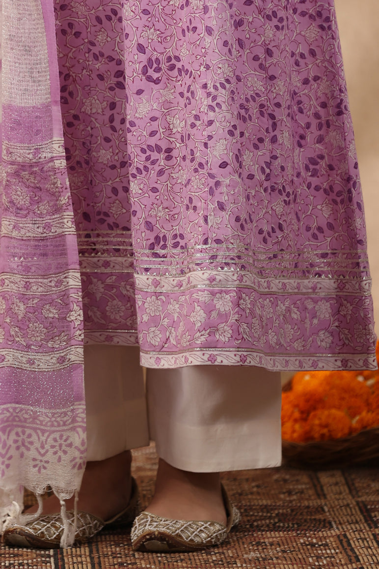 Our classic pink color kurta 2-piece set with a combination of pink and purple colors. This set includes a pink kurta with beautifully done handwork on the yoke, with a decent amount of gota work, also pin tucks on the yoke, kota doriya block printed dupatta.