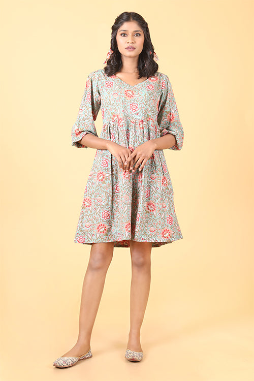 A floral Pistachio with Scarlet Red Handblock Printed Dress features v neck, 3/4 sleeves with side pockets. A comfortable design crafted for summer in superior quality cotton fabric.