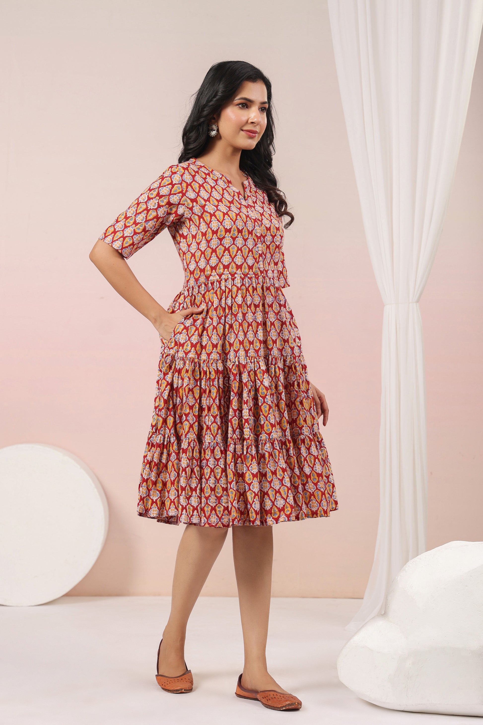 Embrace vibrant elegance with this stunning red handblock tiered dress, a celebration of traditional craftsmanship and bold design. The dress features a rich red base that serves as a striking backdrop for the intricate handblock-printed motifs, adding a touch of artisanal charm to the ensemble. The dress's tiered silhouette creates a flowing, graceful movement, with each tier adding depth and dimension to the overall look. Adorning the red fabric are delicate motifs in cheerful shades of yellow and blue, which infuse the design with lively pops of color.