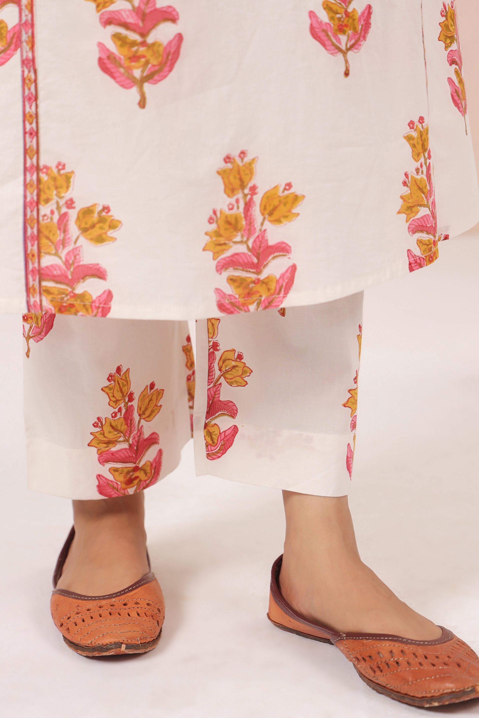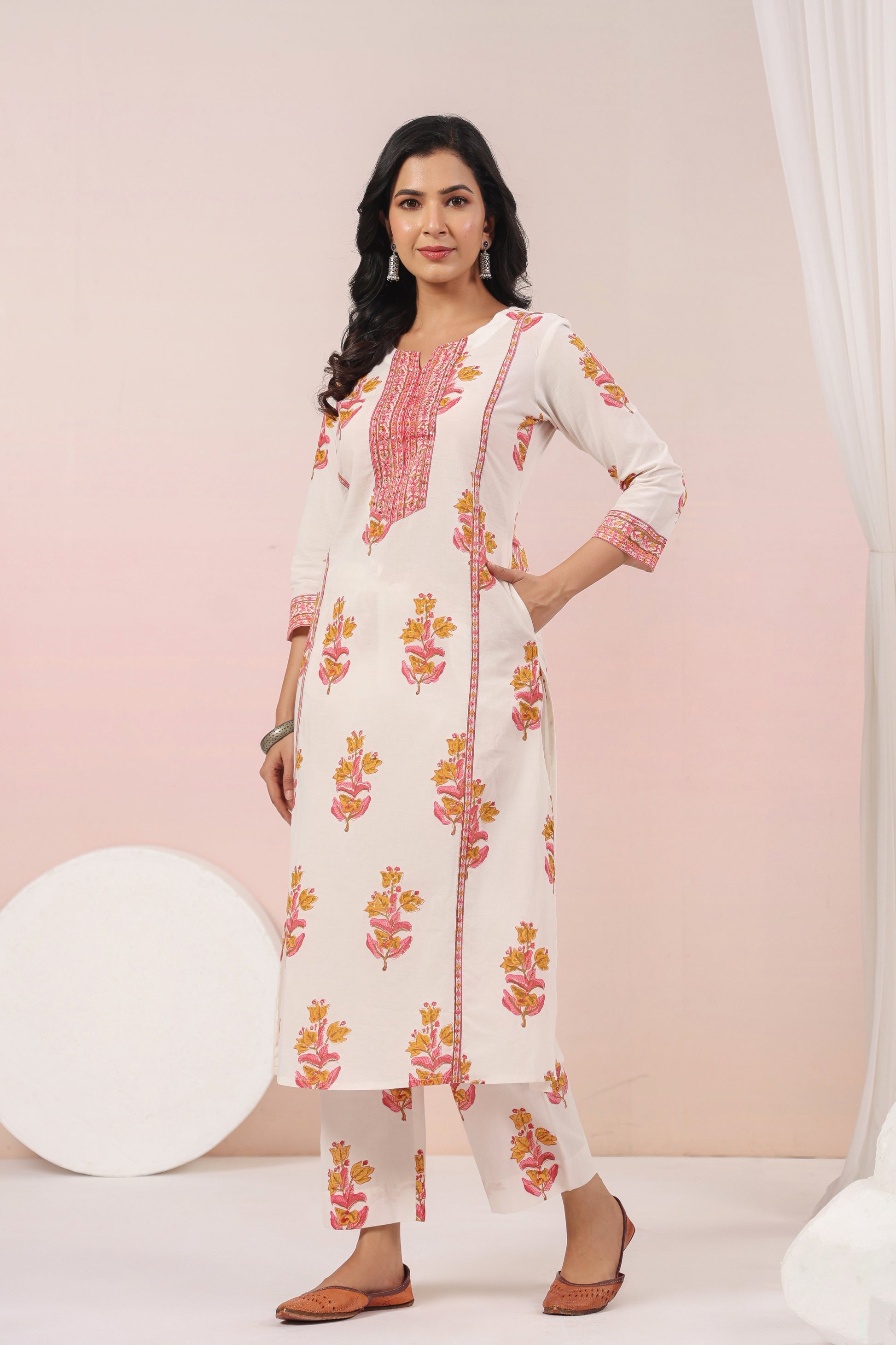 The White and Pink A-line kurta with Pant features a vibrant color palette that beautifully blends tradition with contemporary style. Its flattering silhouette enhances the figure, while intricate patterns and detailing add a touch of elegance. Perfect for festive occasions or casual outings, this kurta and Pant set is a versatile addition to any wardrobe. The soft fabric ensures comfort, making it a go-to choice for all-day wear.