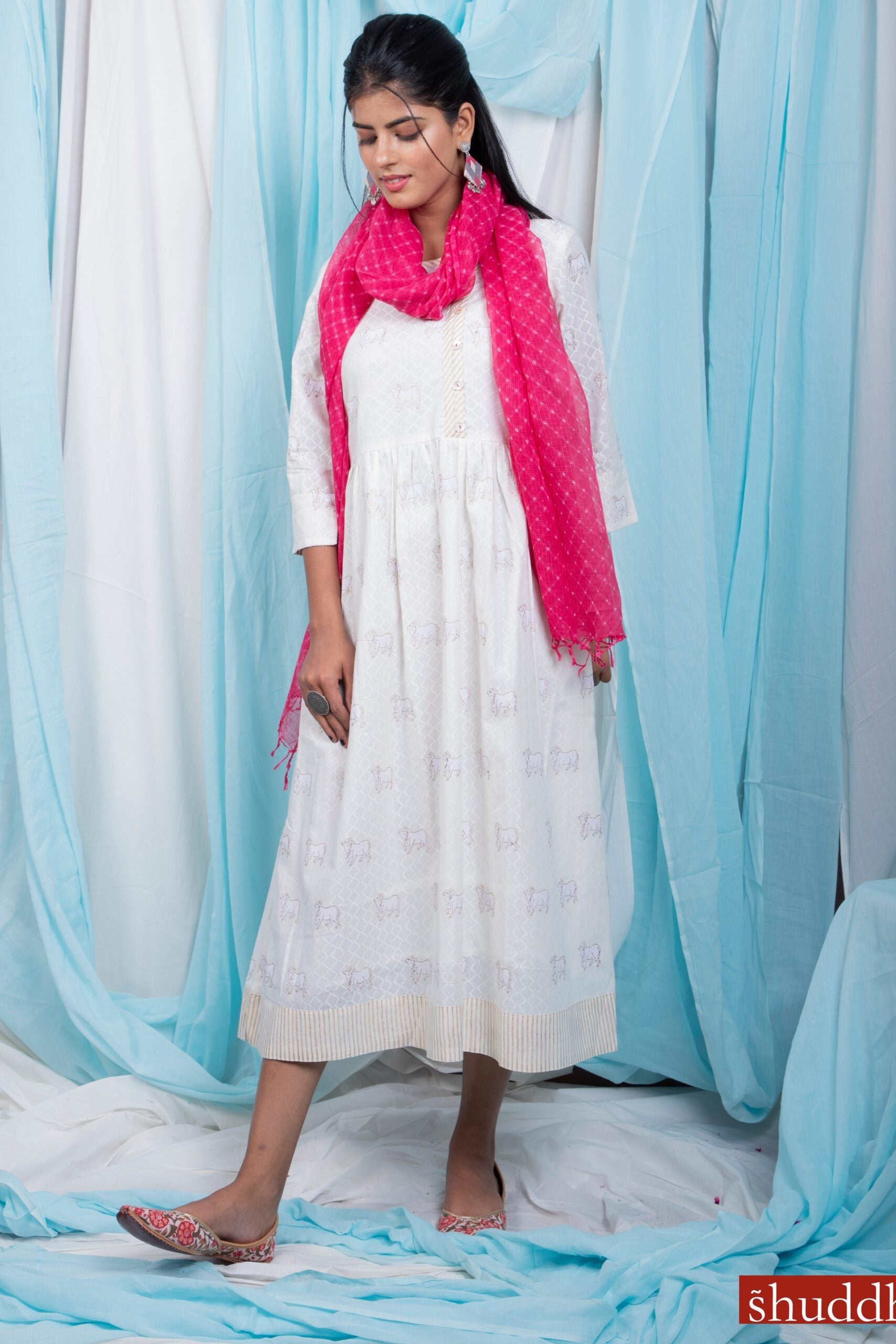 Handblock printed Khadi and Gold printed cow figure dress with side pockets. Style it with nice pink or blue scarf and jutti for complete look.
