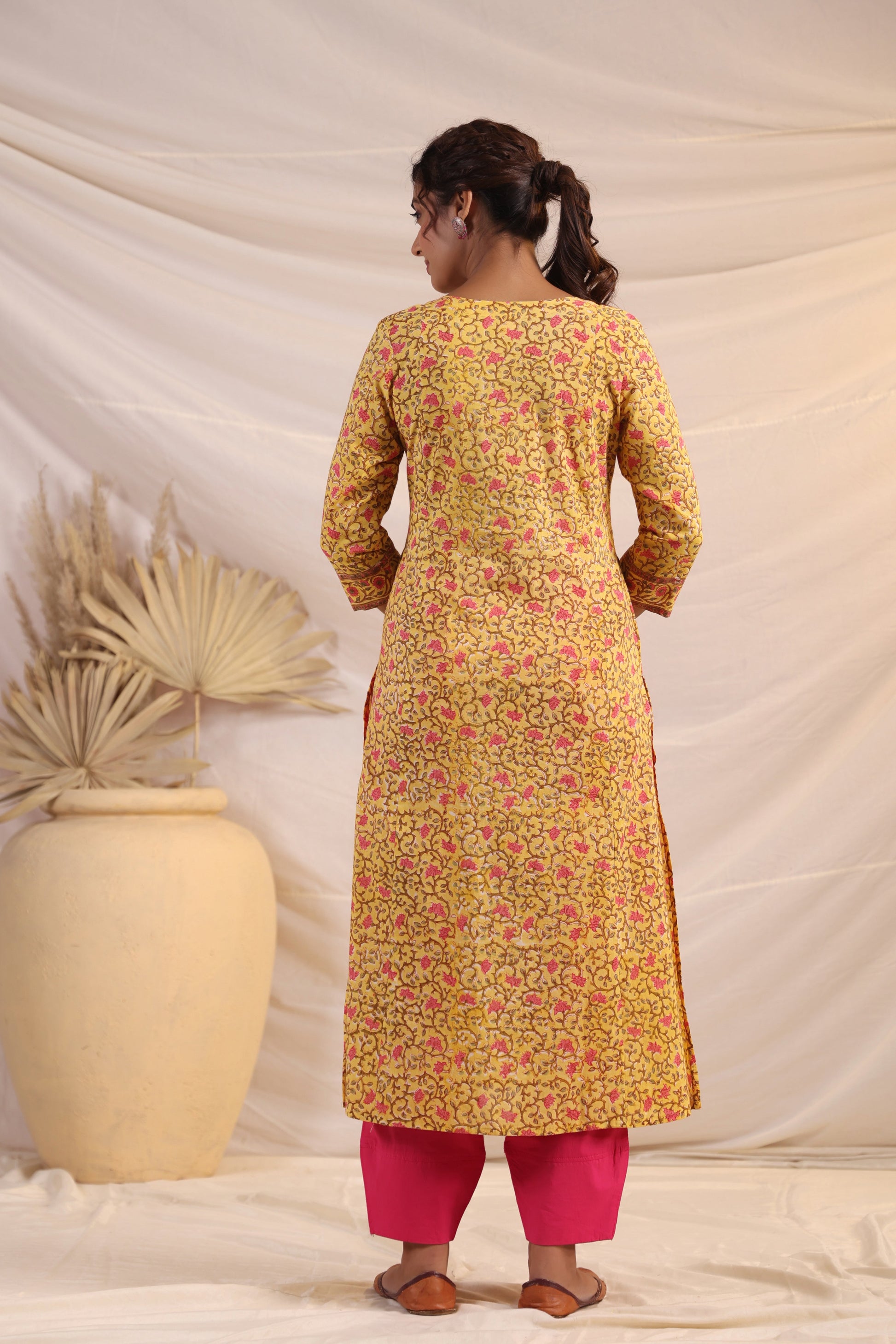 The Pink and Yellow Kurta features a vibrant color palette that beautifully blends tradition with contemporary style. Its flattering silhouette enhances the figure, while intricate patterns and detailing add a touch of elegance. Perfect for festive occasions or casual outings, this versatile is a versatile addition to any wardrobe. The soft fabric ensures comfort, making it a go-to choice for all-day wear.