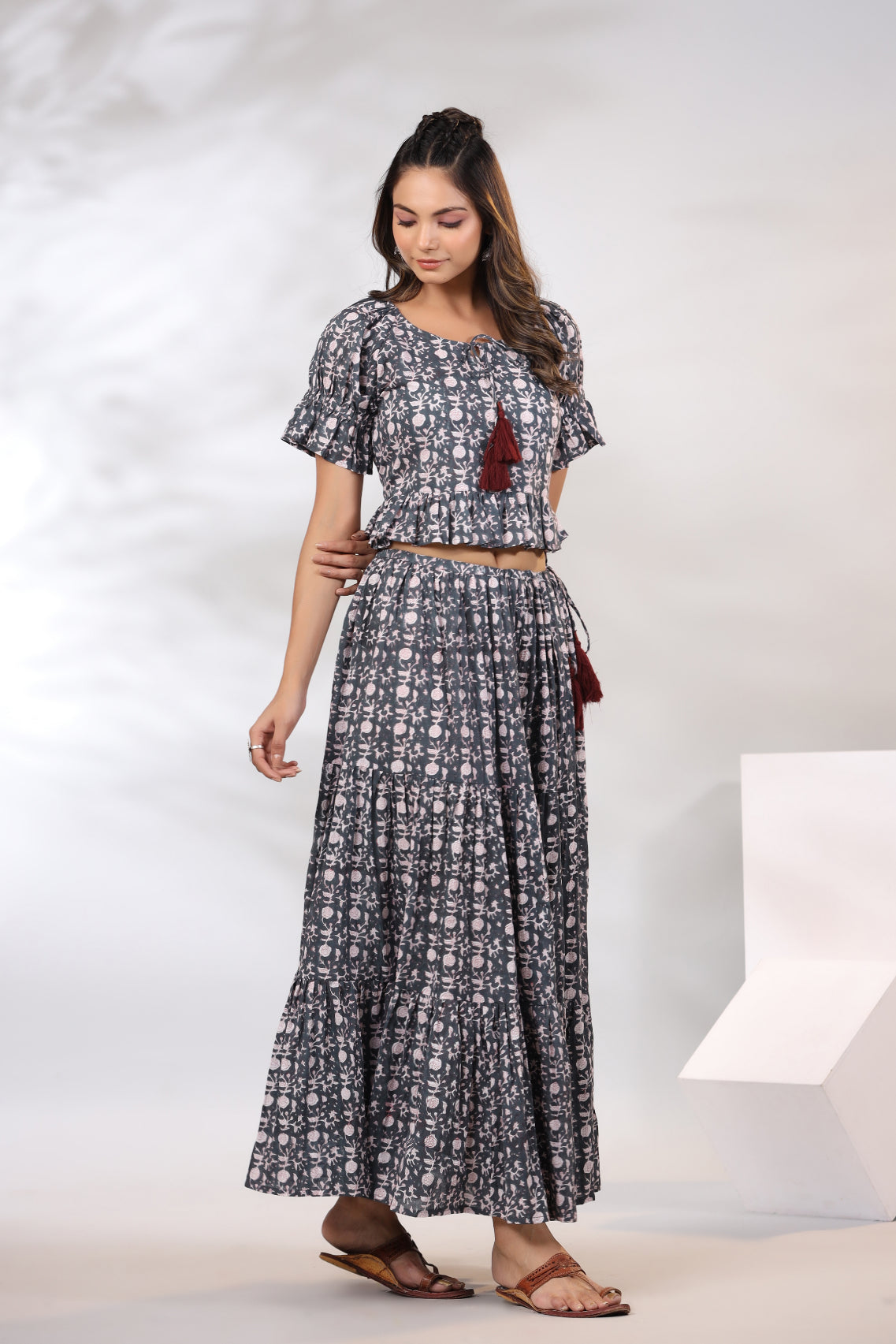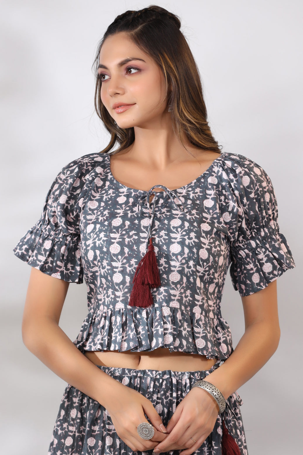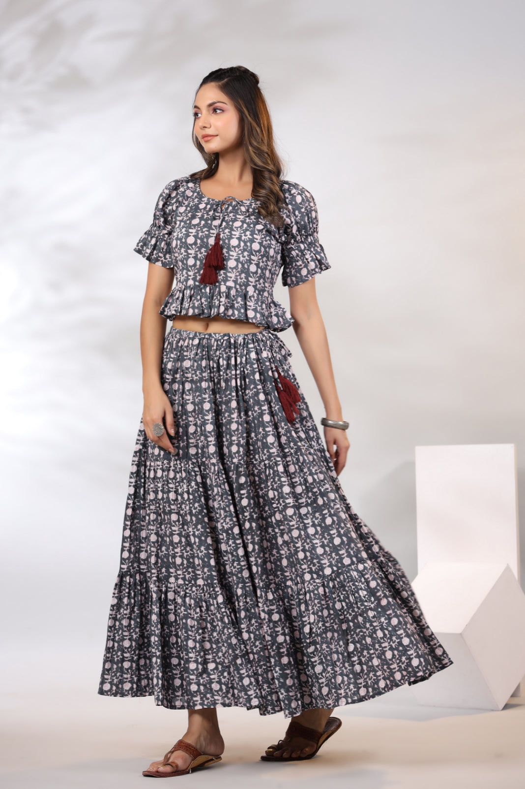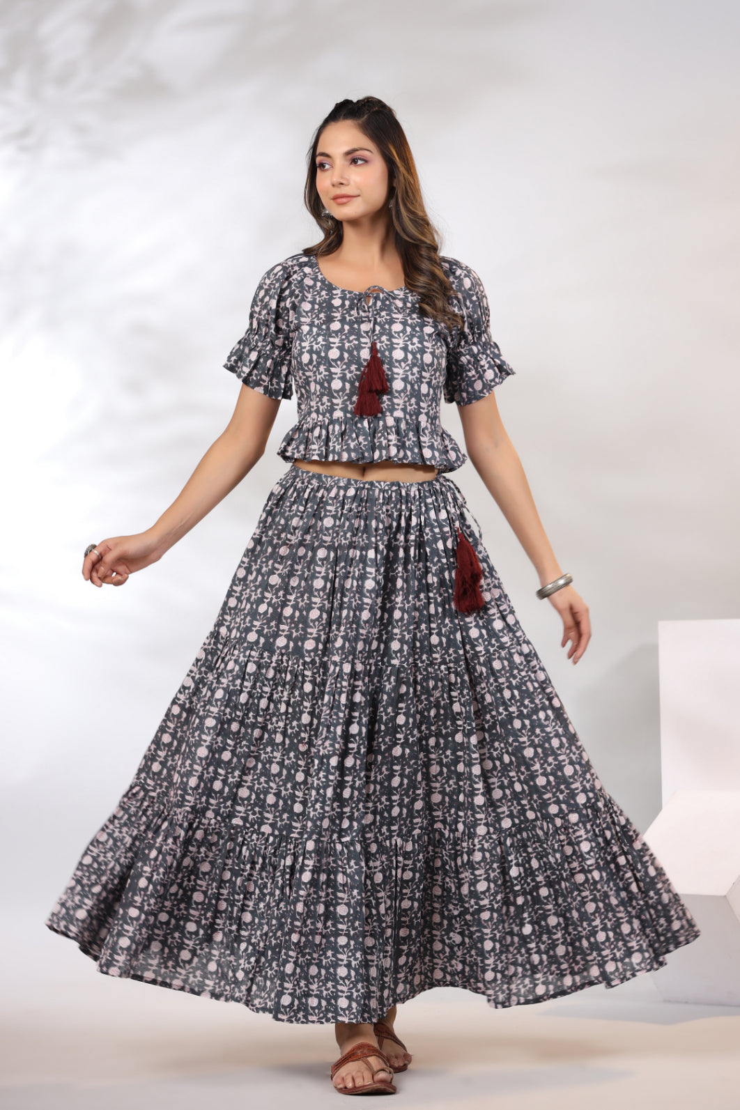 Our Fascinationg SPRUCE GREEN 2-PIECE CO-ORD SET Comes With a Skirt & Blouse & Combination of Brown Outlined Flowers With Gathered Sleeves, Carefully Assembled For Perfect Look.