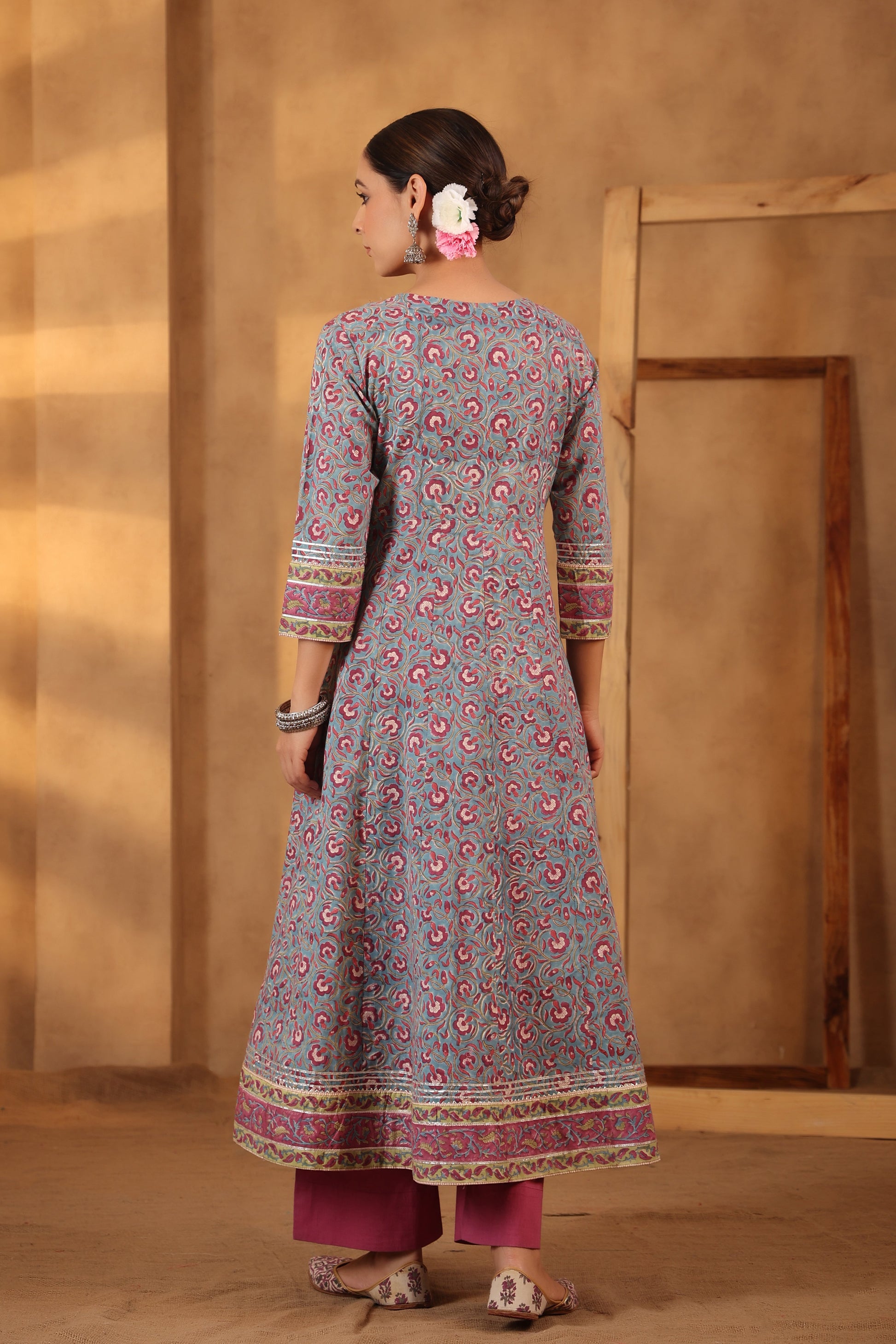 Our classic Steel blue with combination of rouge pink, handblock printed, v neck floral anarkali kurta, comes with moti button down. In soft cotton fabric. It embellished with intricate sequence and gota work on yoke and cuffs, accentuates its appeal. Carefully assembled for a gorgeous look.