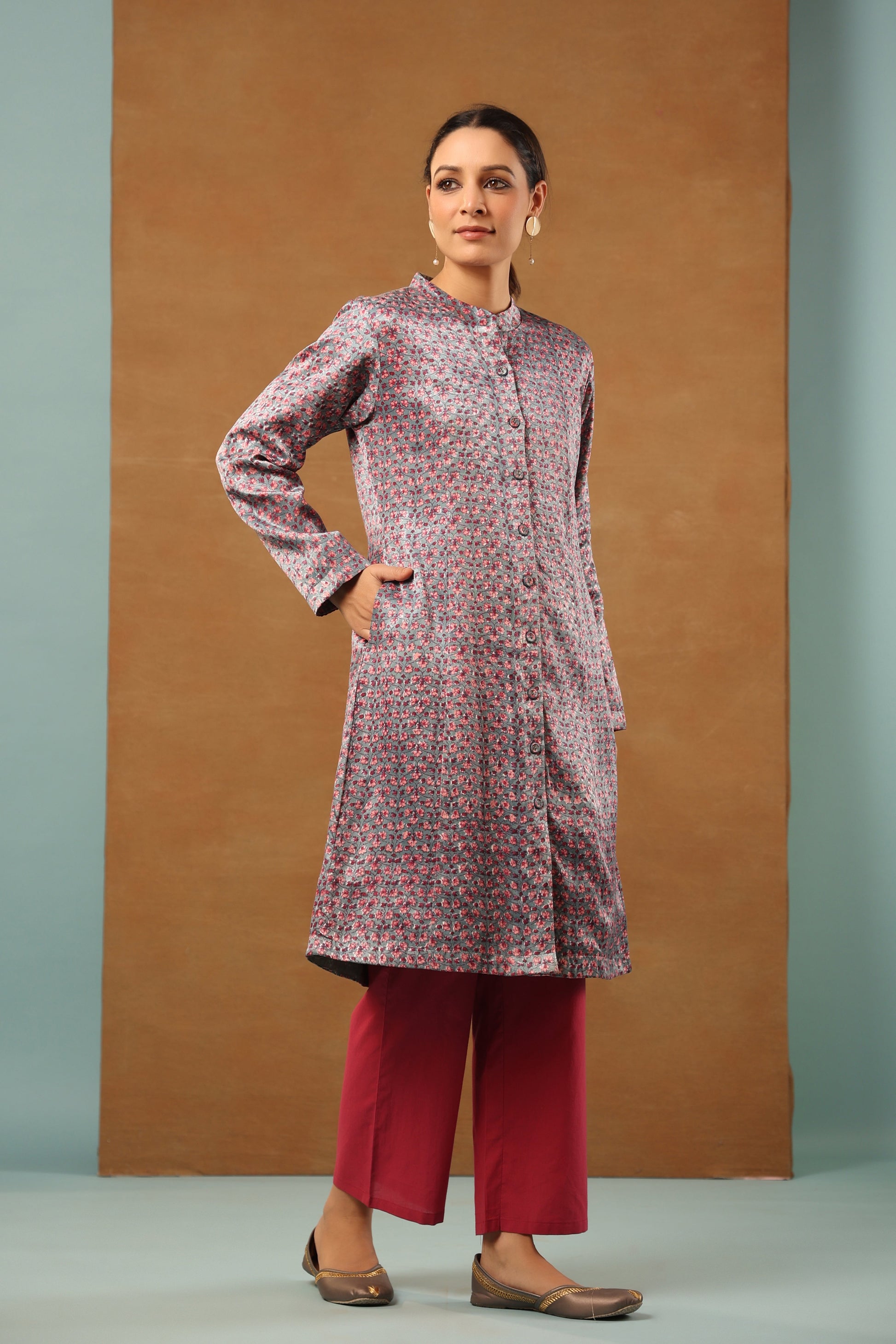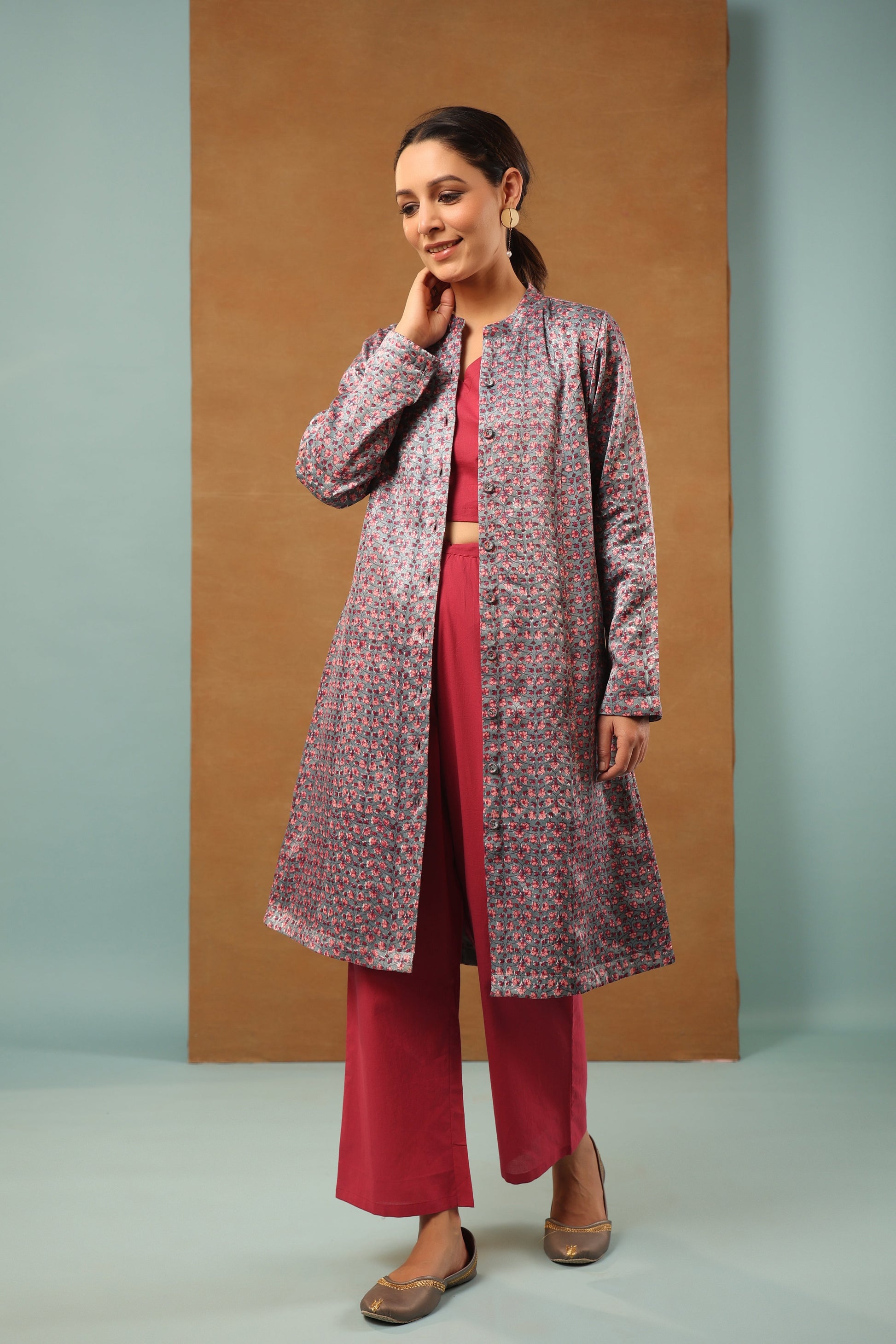 Our classic stone blue with rouge pink mashru silk Long jacket comes with a combination of apricot orange and white floral handblock printed. Mashru is a woven cloth that is blend of silk and cotton to keep it light and warm. Pair it with silk saree or pants, perfect for any occasion.