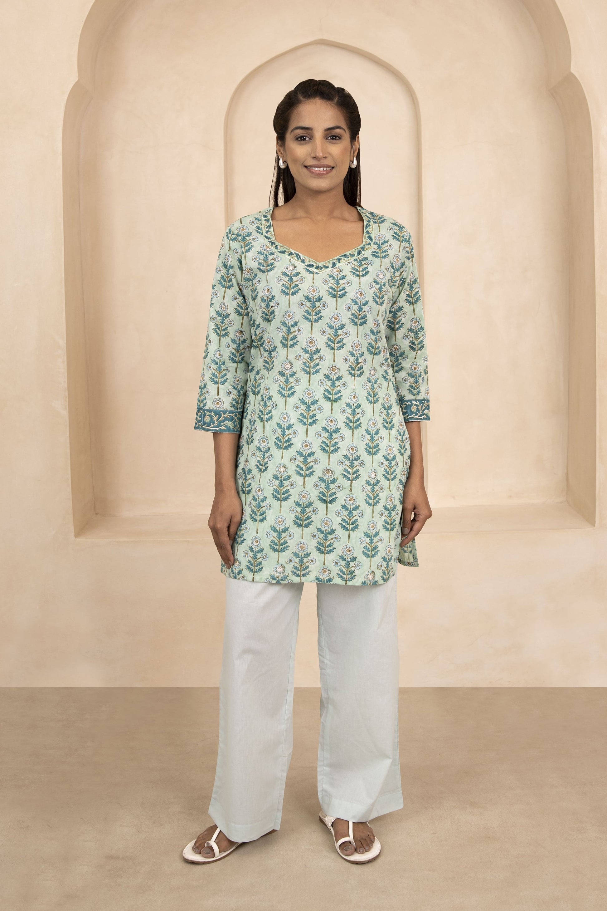 This soothing handblock-printed Short Kurti features a fresh mint green base with vertical floral bootis in deep green and blue. Crafted on soft cotton, it has a comfortable V-neckline with printed piping and 3/4 length sleeves. A breezy and elegant pick for everyday ethnic charm.