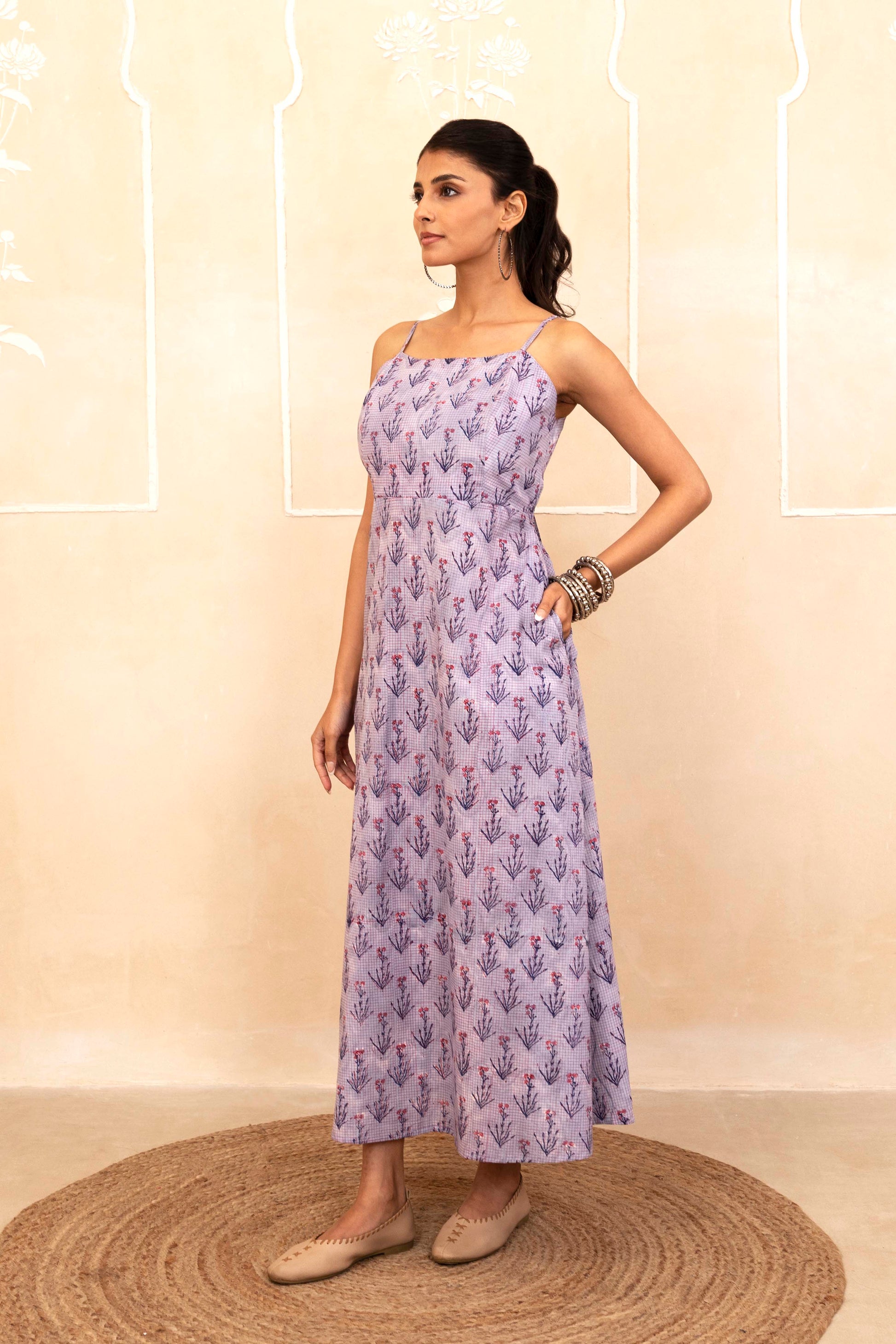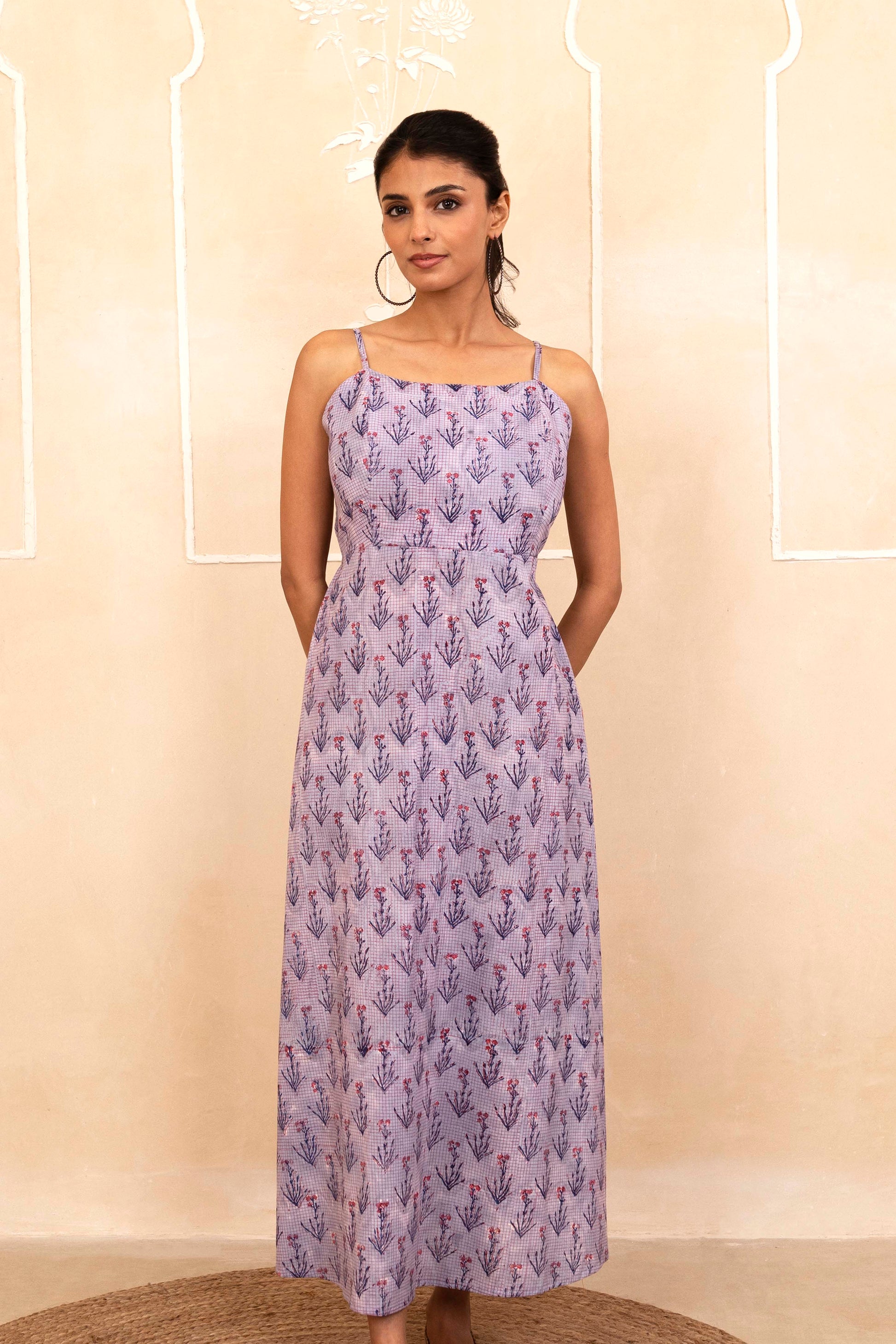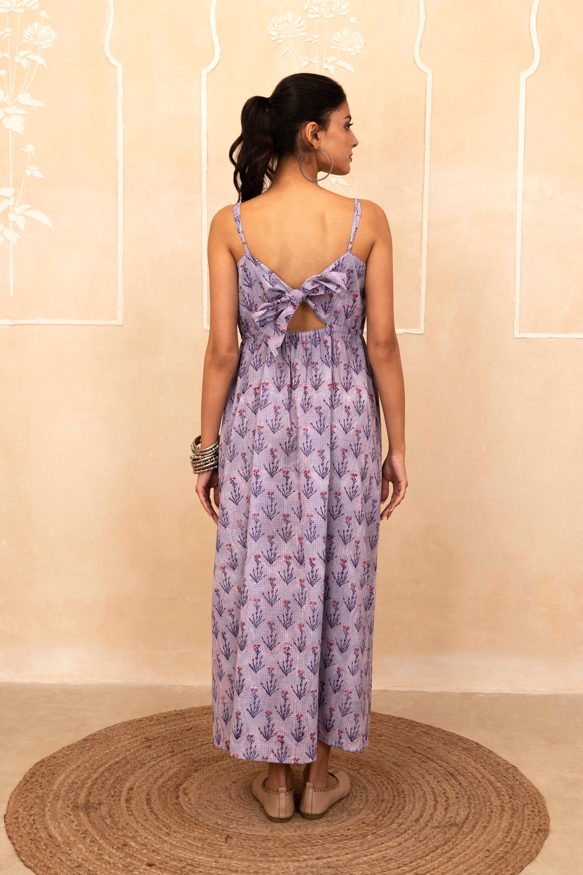 Effortlessly elegant, this handblock-printed dress features delicate floral motifs on a soft lilac base, enhanced by fine checkered patterns. The halterneck-inspired front with thin shoulder straps offers a graceful neckline, while the back showcases a charming bow tie and a subtle cut-out, adding a playful touch. Crafted from breathable cotton, this ankle-length dress is perfect for summer brunches, casual outings, or relaxed evenings. A beautiful blend of tradition and contemporary style.
