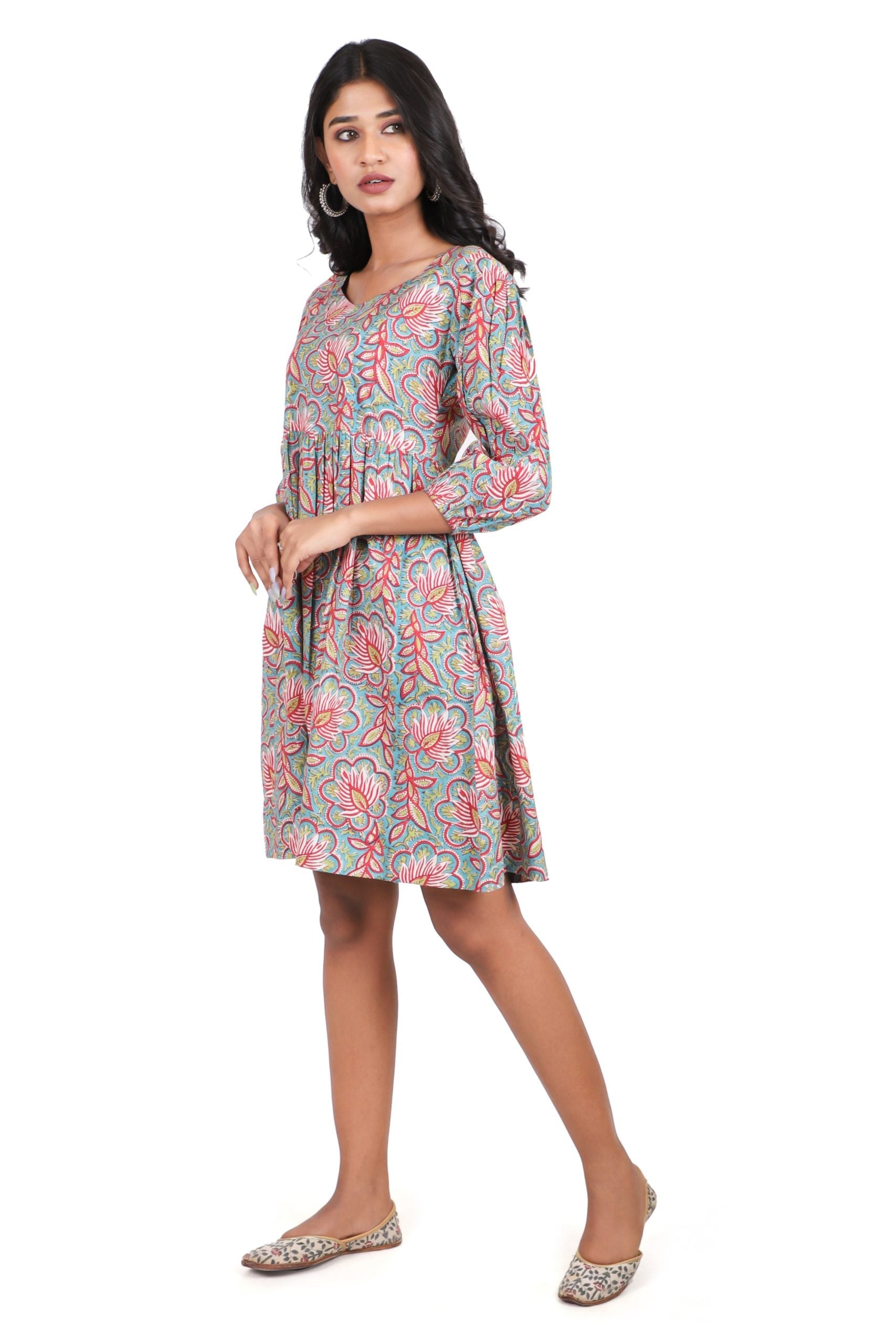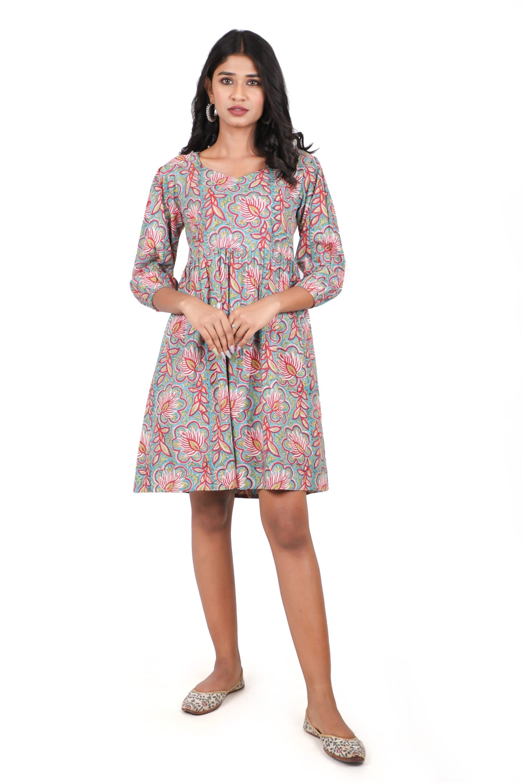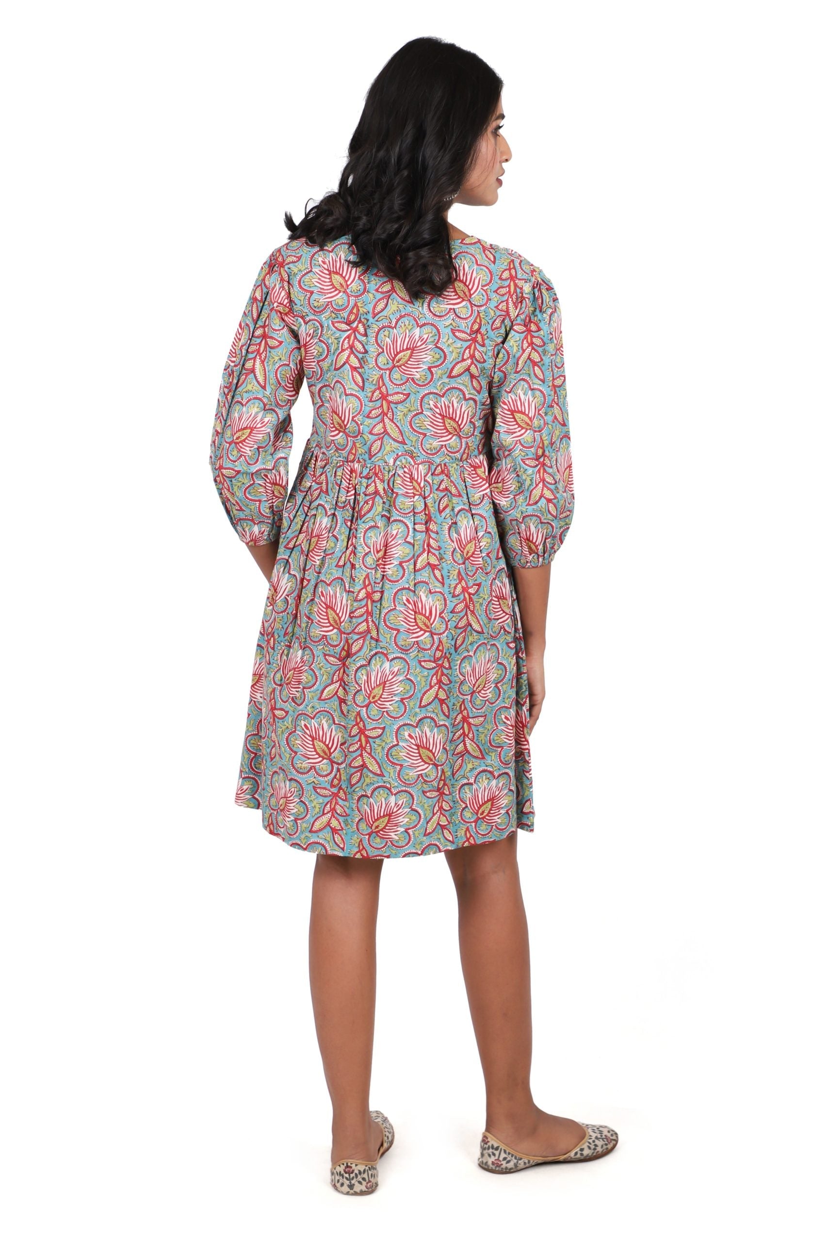 Tiffany Blue with a Combination of Scarlet Red Handblock Dress