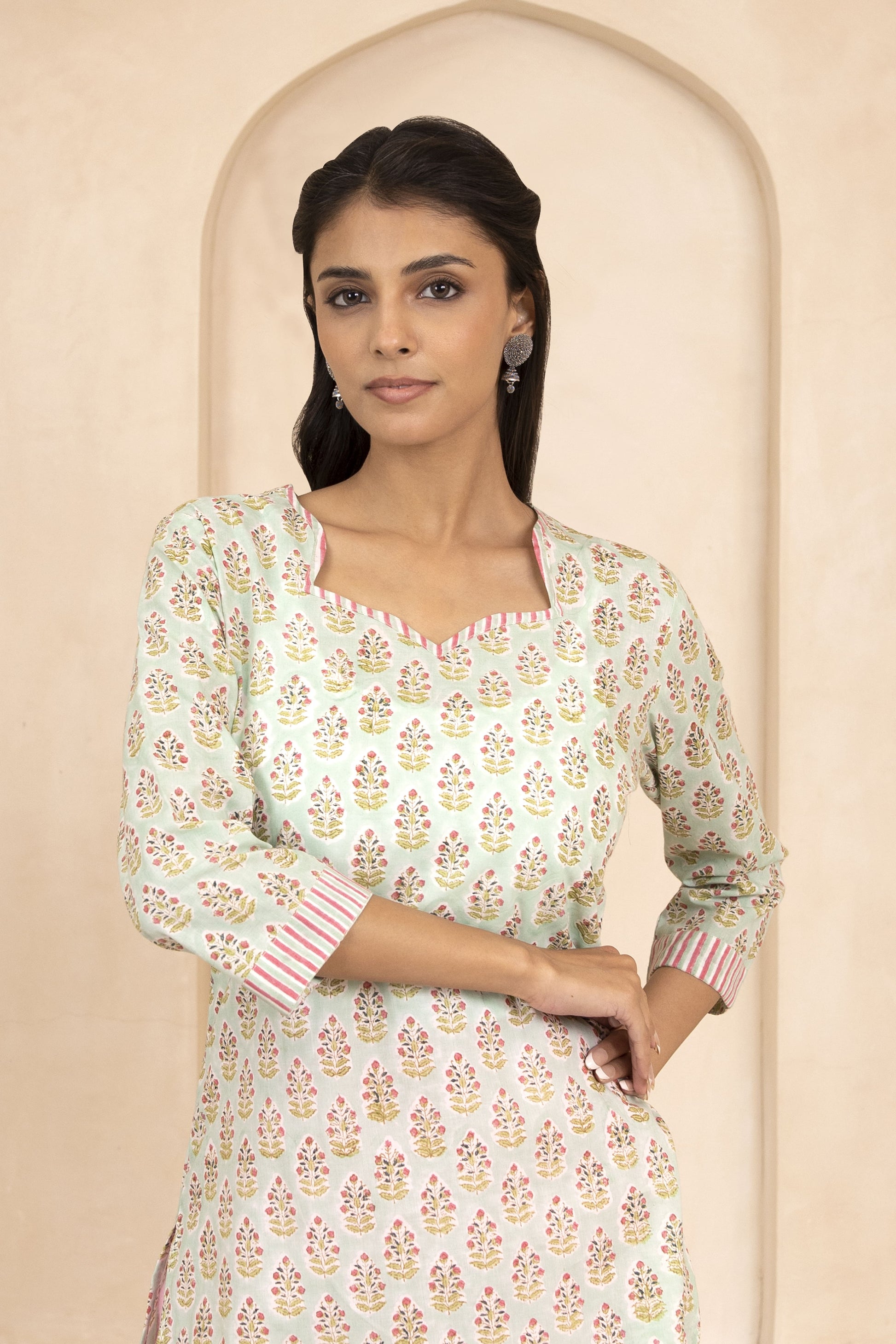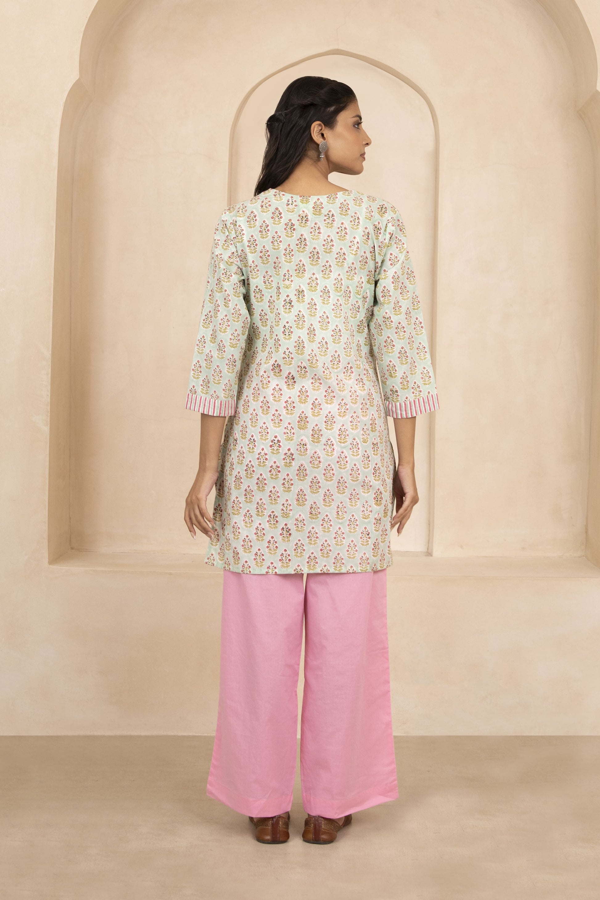 Soft elegance meets timeless tradition in this mint green Short Kurti, featuring delicately hand block printed floral boota motifs in shades of rose pink and olive. The notched neckline and subtle pink piping add an extra layer of charm, while the striped cuffs on the 3/4 sleeves bring a playful contrast. Crafted in breathable cotton, this kurta is perfect for all-day wear—be it at home, work, or a leisurely brunch.