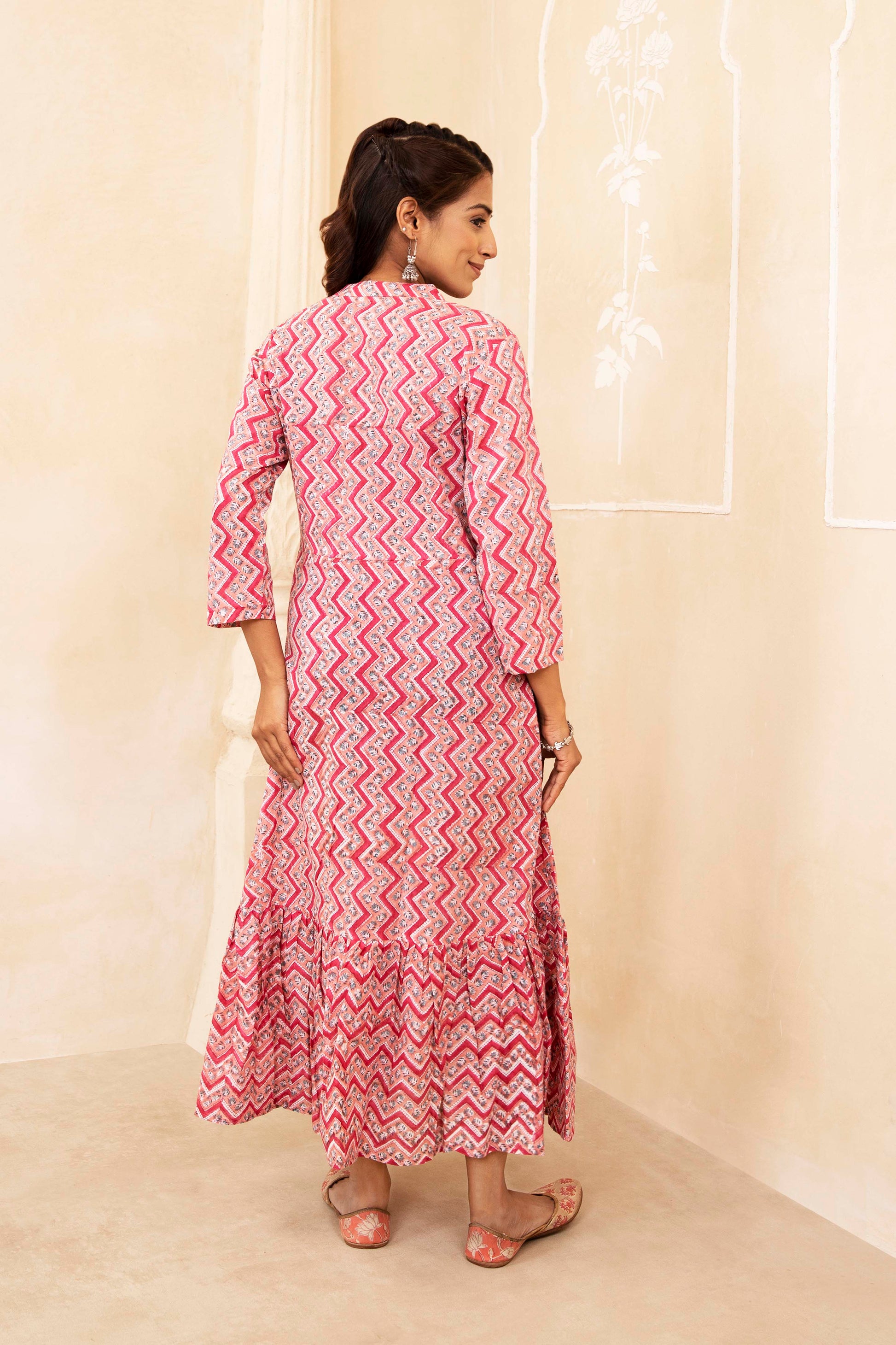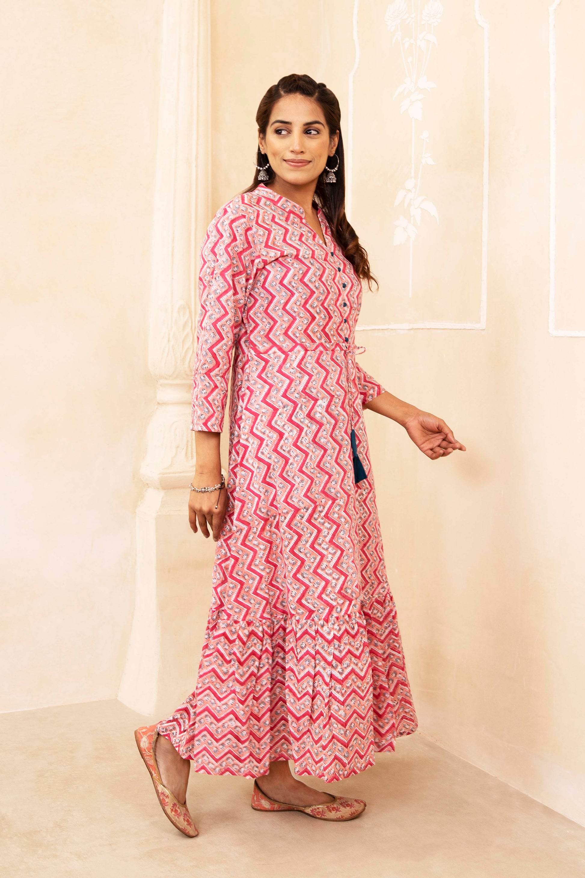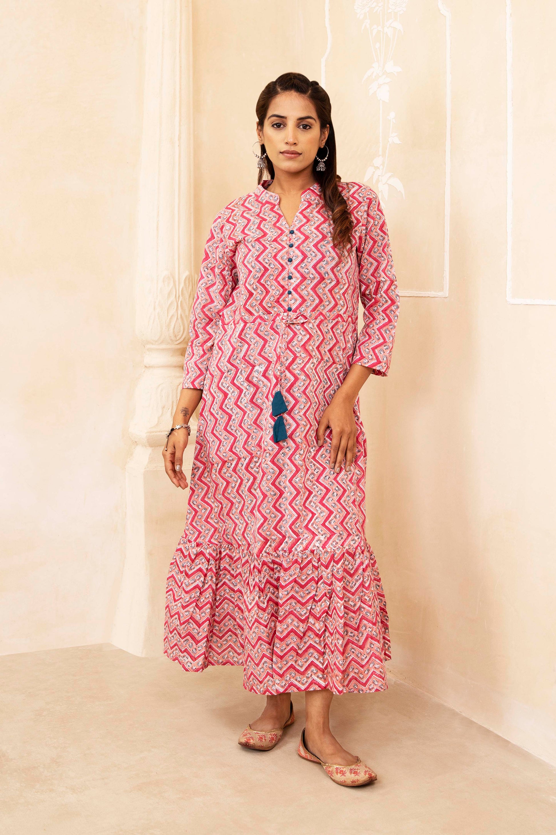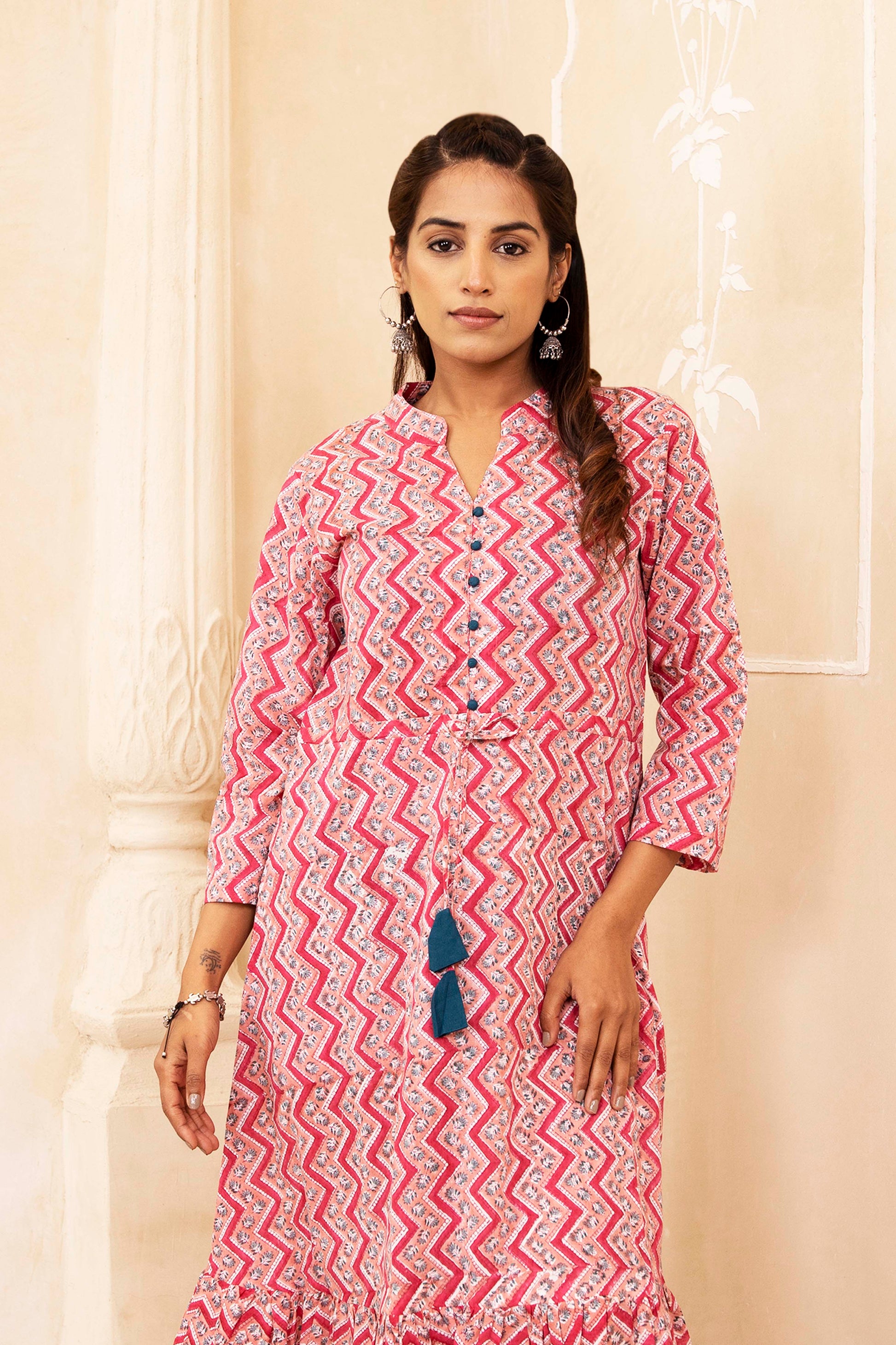Vibrant and playful, this Peach zigzag printed dress features a smart mandarin collar and wooden button placket, enhanced by charming teal tassels. The elasticated waist and flared tiered hem add movement and grace, making it an easy choice for both casual gatherings and festive occasions. Crafted in breathable cotton, it combines everyday comfort with artisanal flair.