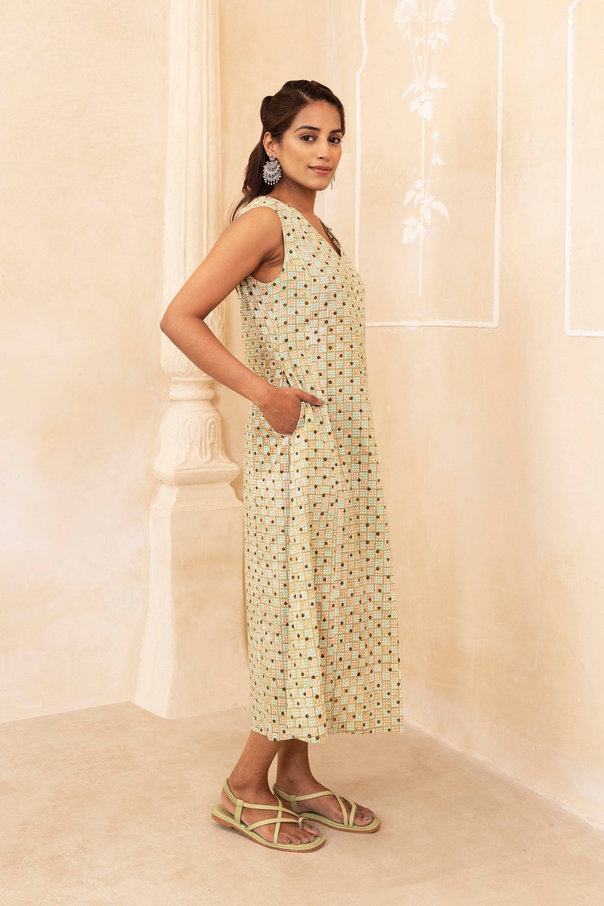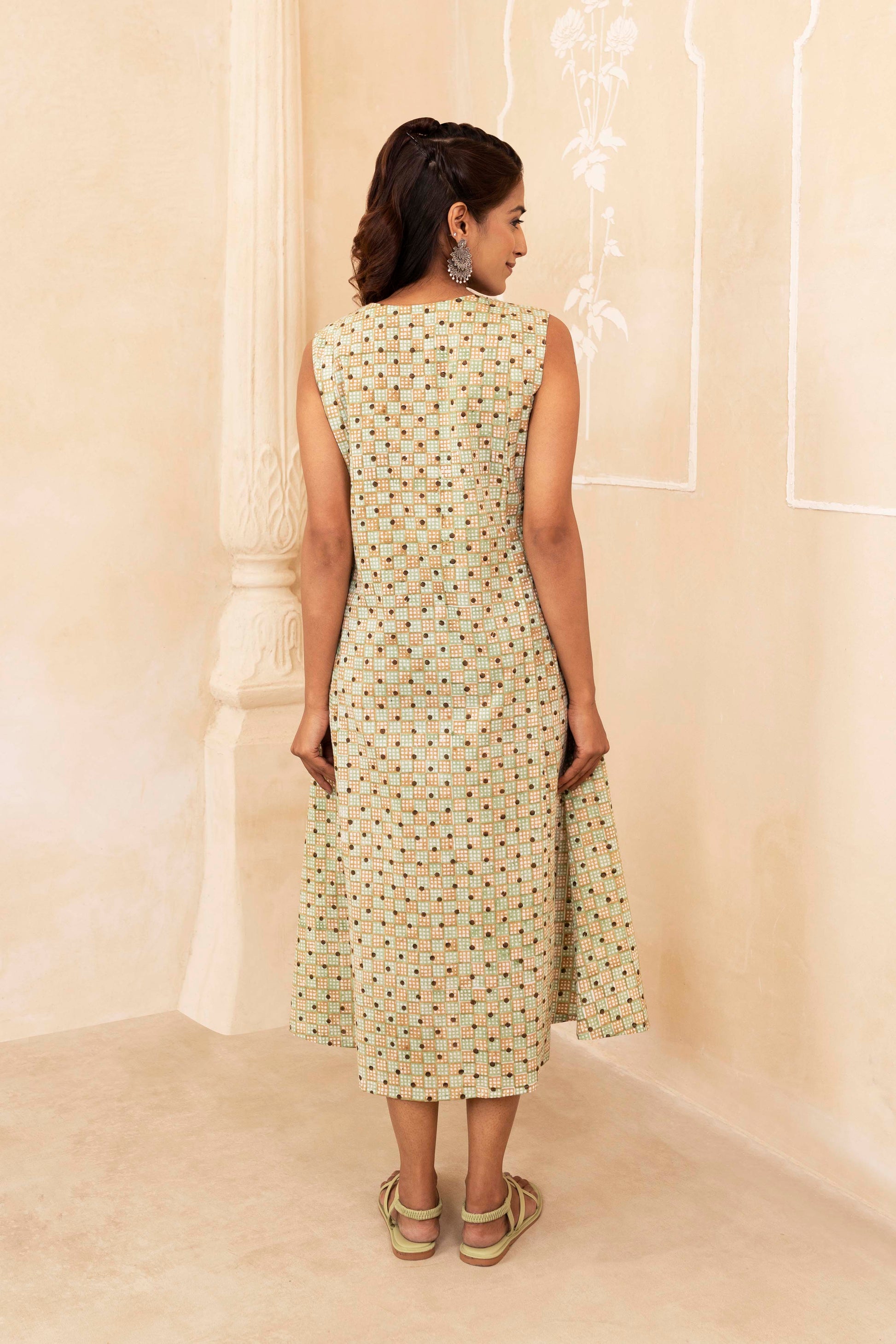 A graceful blend of structure and comfort, this sleeveless pleated dress features a subtle checkered block print in soothing pastel tones. The soft V-neckline and front pleat detailing add refined charm to the silhouette, making it a breezy choice for summer days. Effortlessly stylish and breathable, it’s perfect for brunches, casual workdays, or artful escapes.