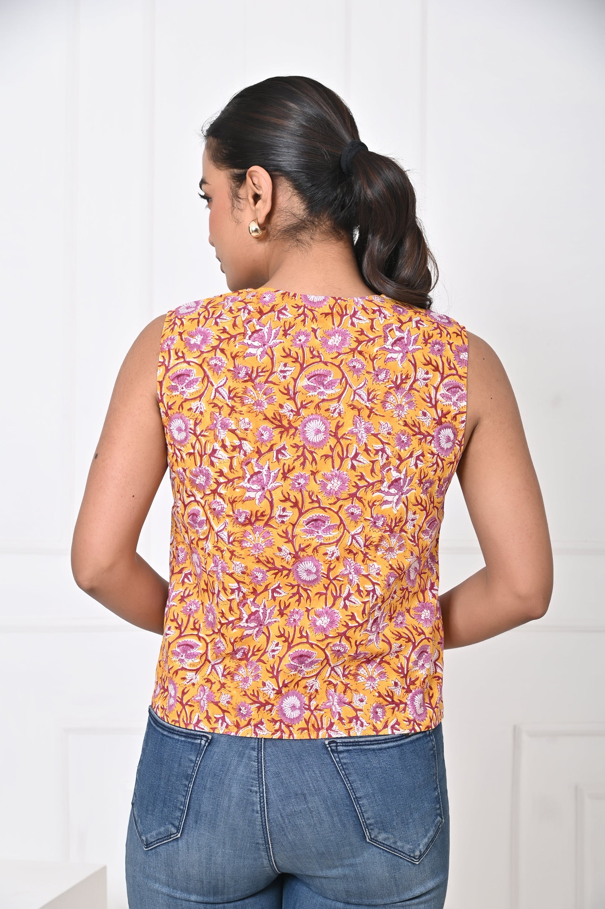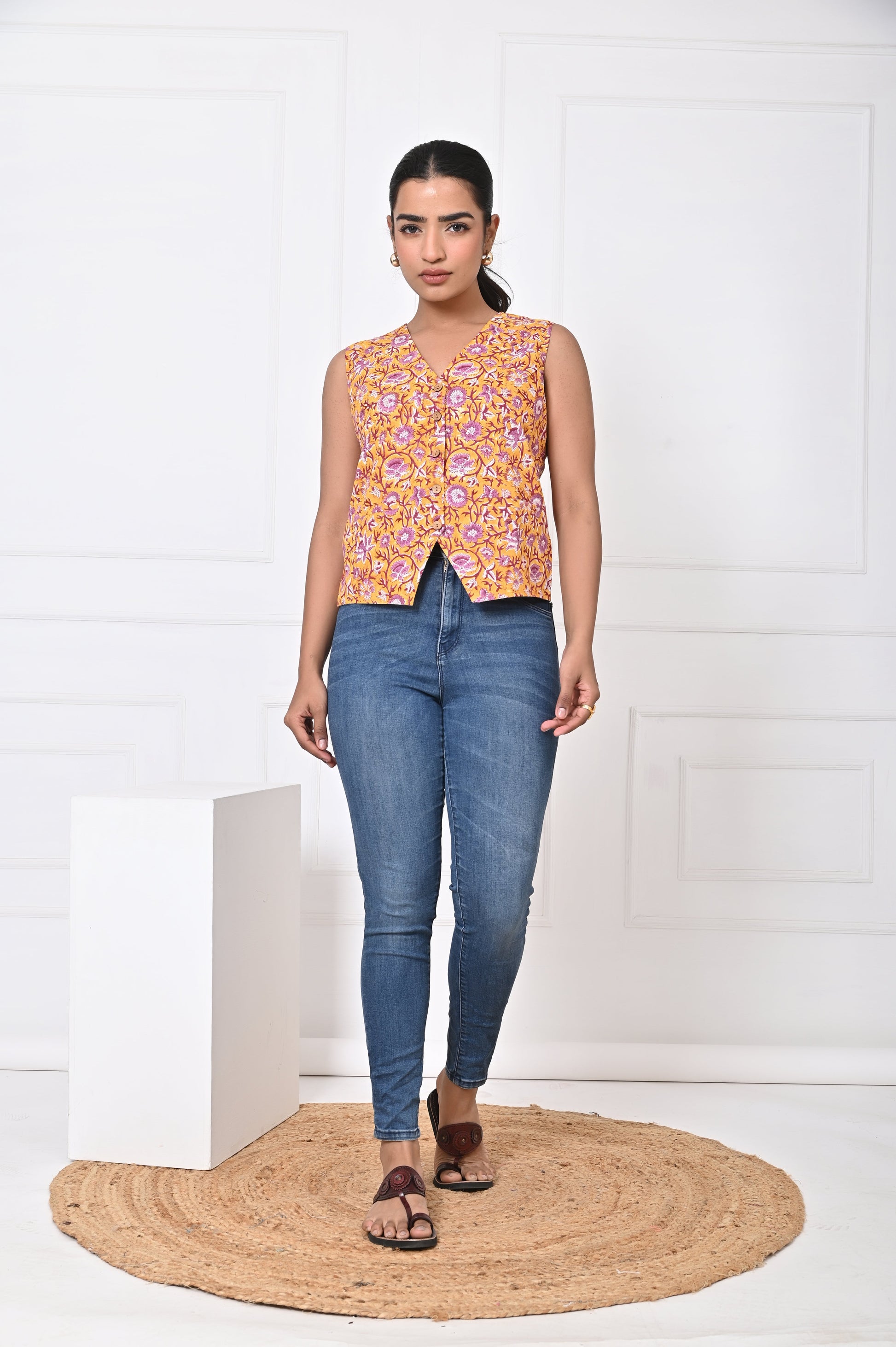 The beauty of the block-printed Koti lies in its adaptability. During the day, it can be paired with casual jeans or lightweight pants, creating a relaxed yet chic look perfect for lunch outings, casual gatherings, or workdays. For a more laid-back vibe, it can also be styled with shorts, adding an element of effortless cool while still maintaining elegance.
