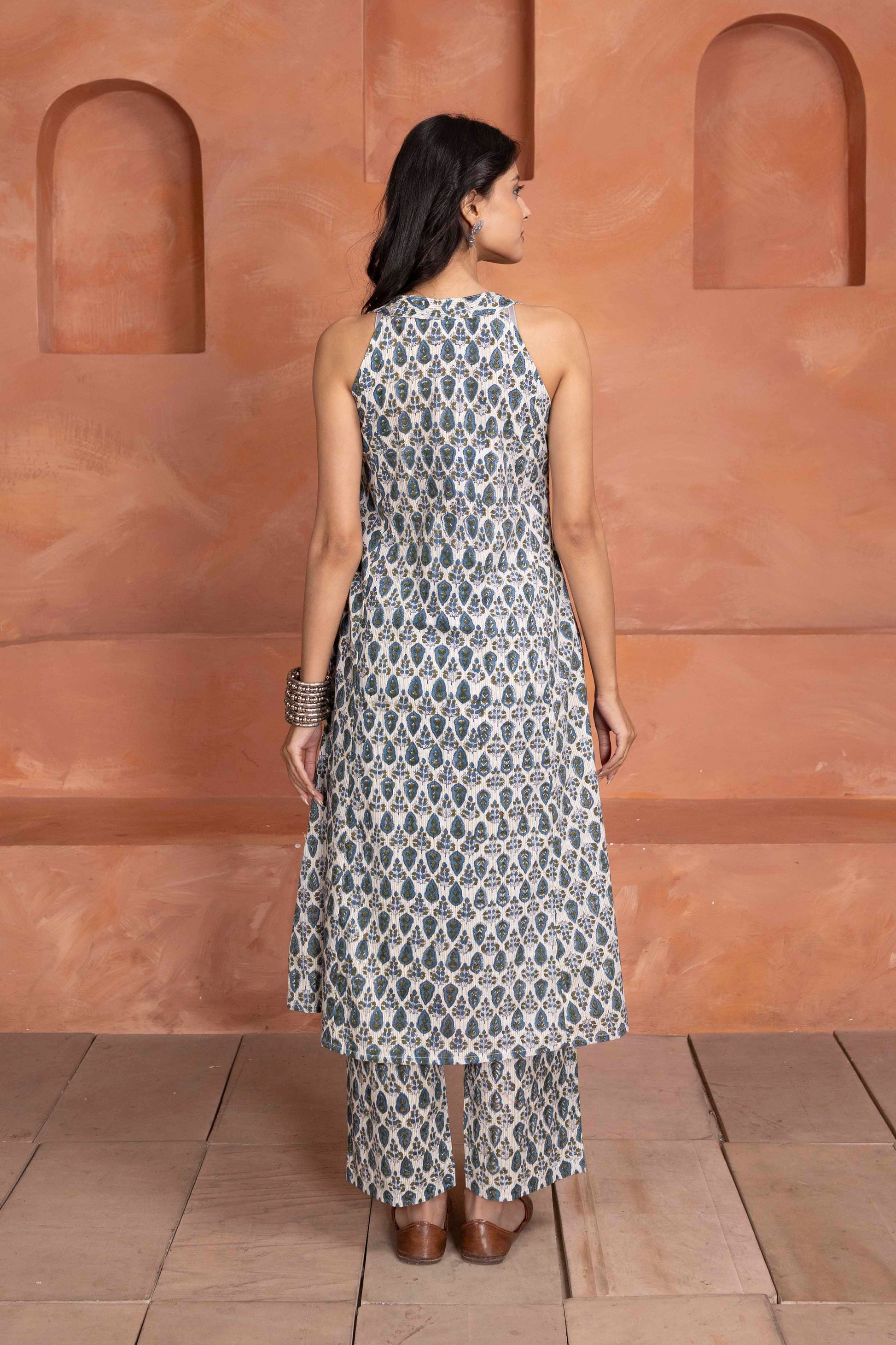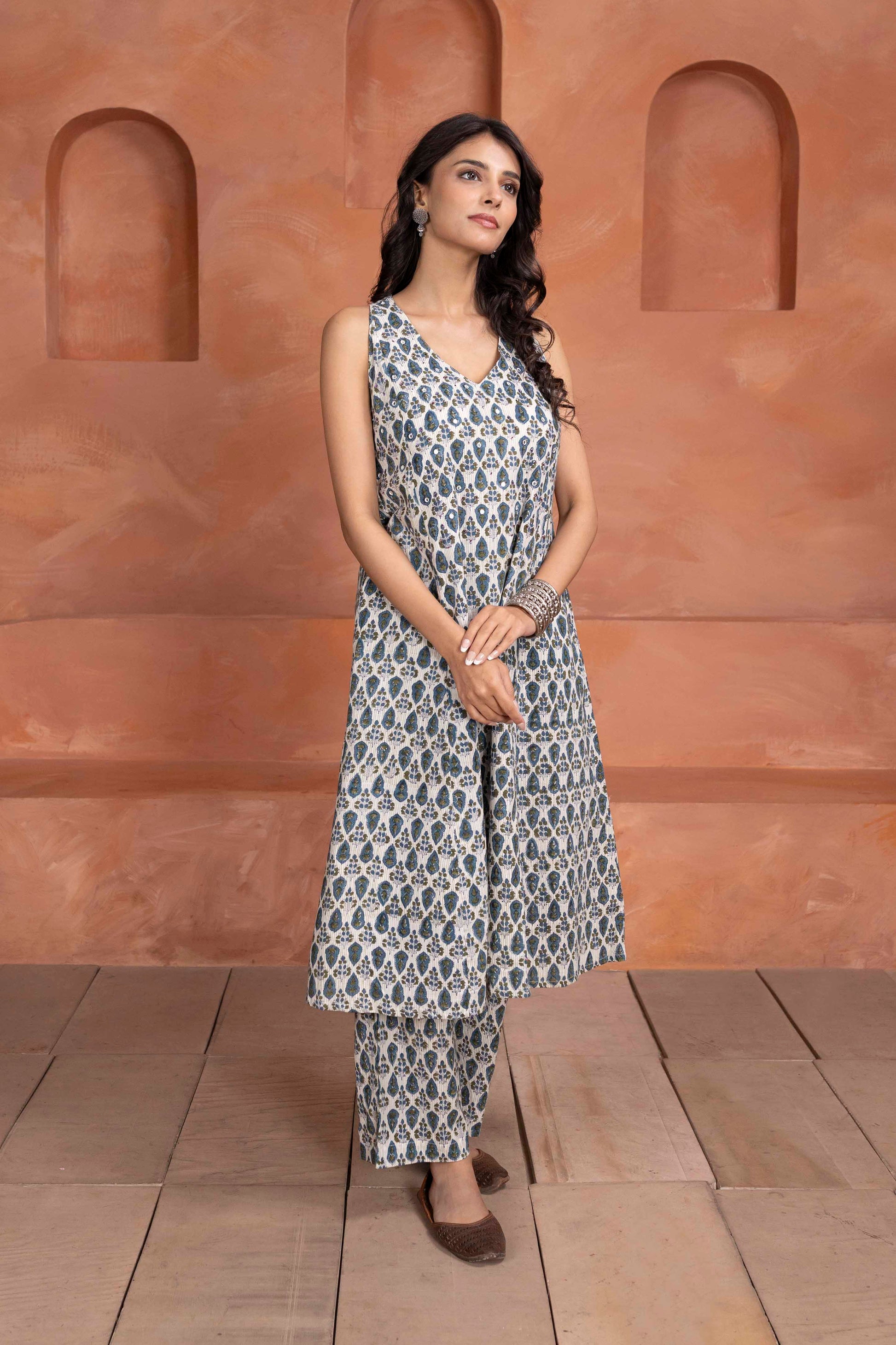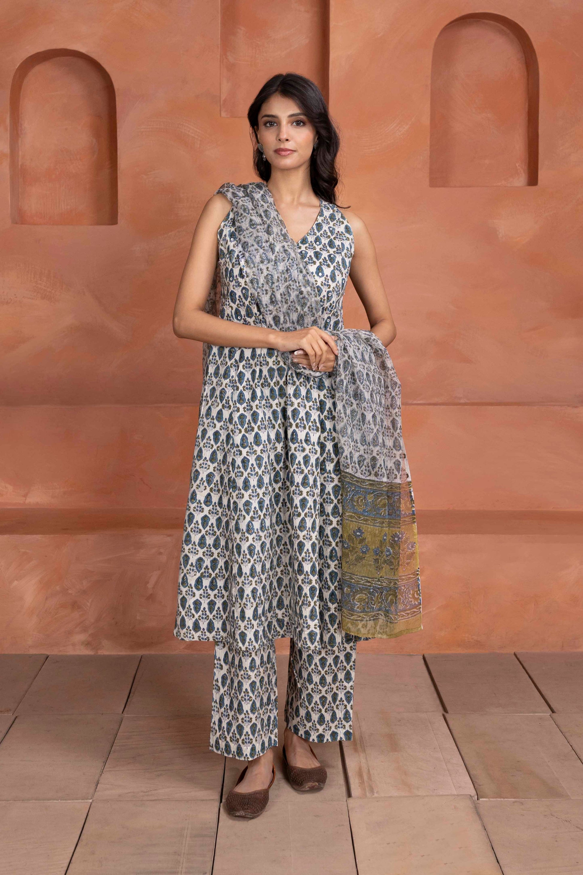 This chic handblock-printed 3-piece set features a sleeveless A-line kurta with a subtle V-neckline, showcasing intricate paisley motifs in earthy indigo and olive tones. Paired with coordinated straight pants and a soft, printed dupatta with traditional borders, the ensemble brings together simplicity and grace—making it a perfect pick for summer outings or relaxed festive days.