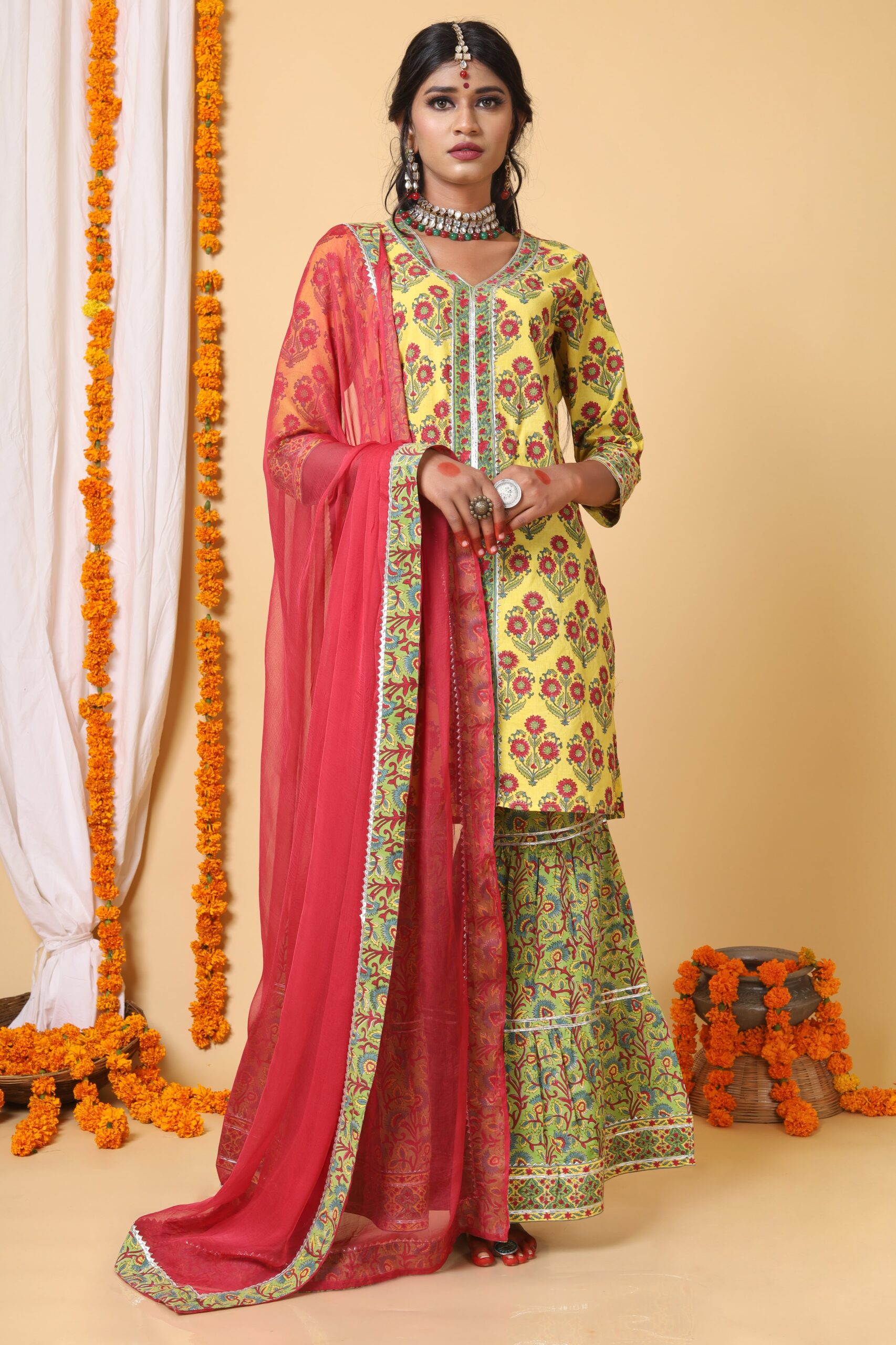 A classic sharara set is a perfect piece to wear this festive season. Handblock printed sharara and kurti with duppatta comes with gota lace work and sequence work. Pair it with Jutti or kohlapuri for a perfect look.