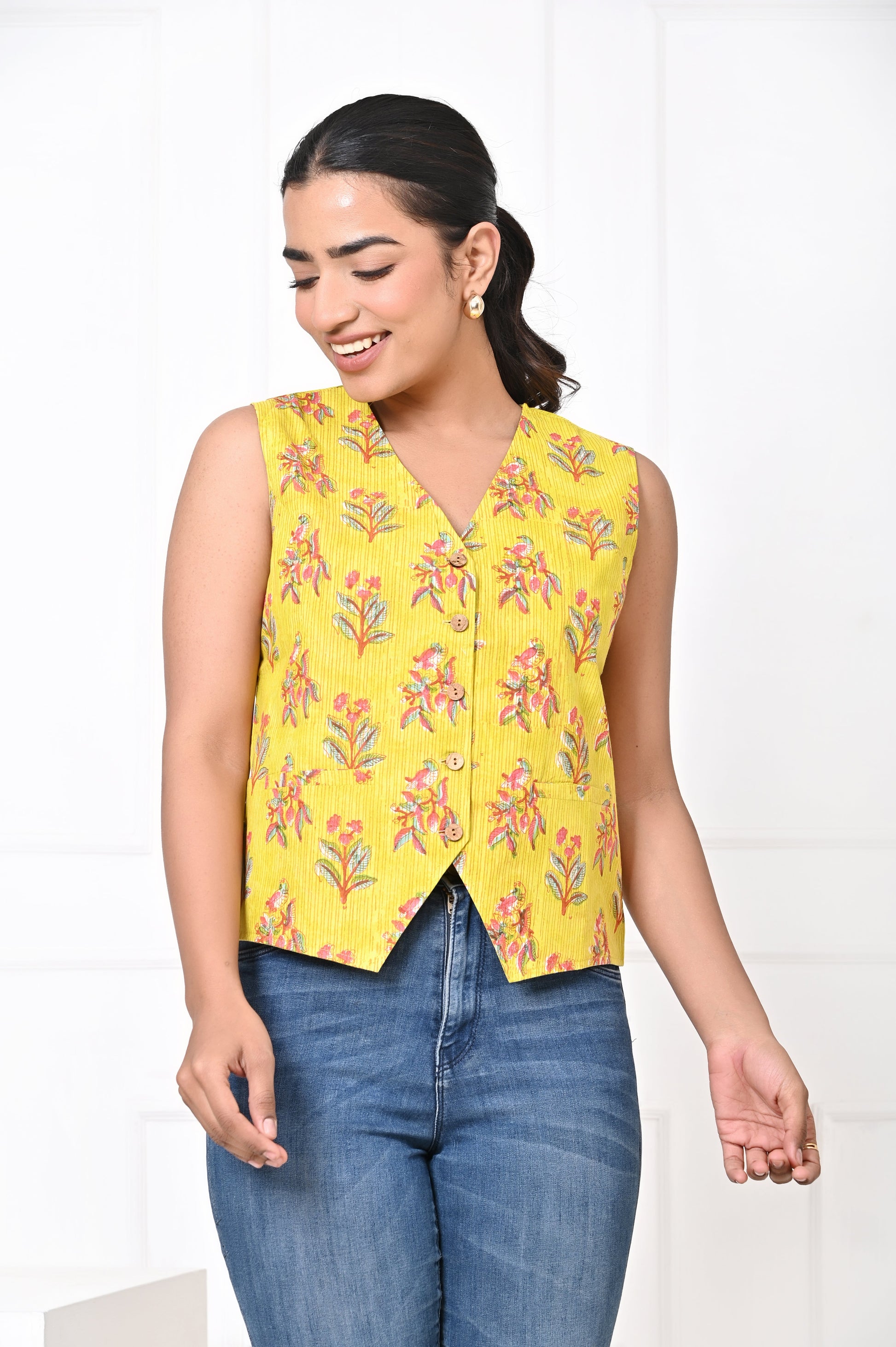 The beauty of the block-printed Koti lies in its adaptability. During the day, it can be paired with casual jeans or lightweight pants, creating a relaxed yet chic look perfect for lunch outings, casual gatherings, or workdays. For a more laid-back vibe, it can also be styled with shorts, adding an element of effortless cool while still maintaining elegance.