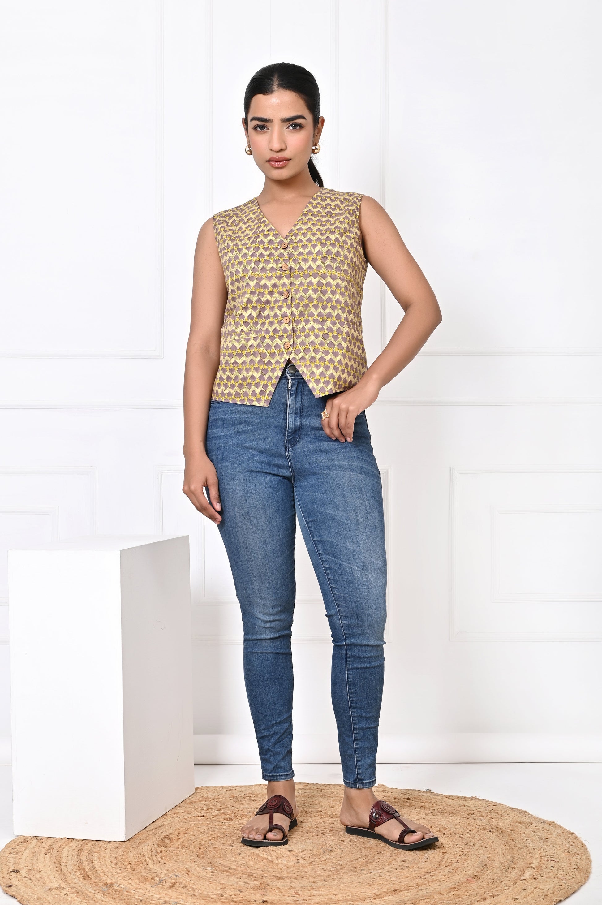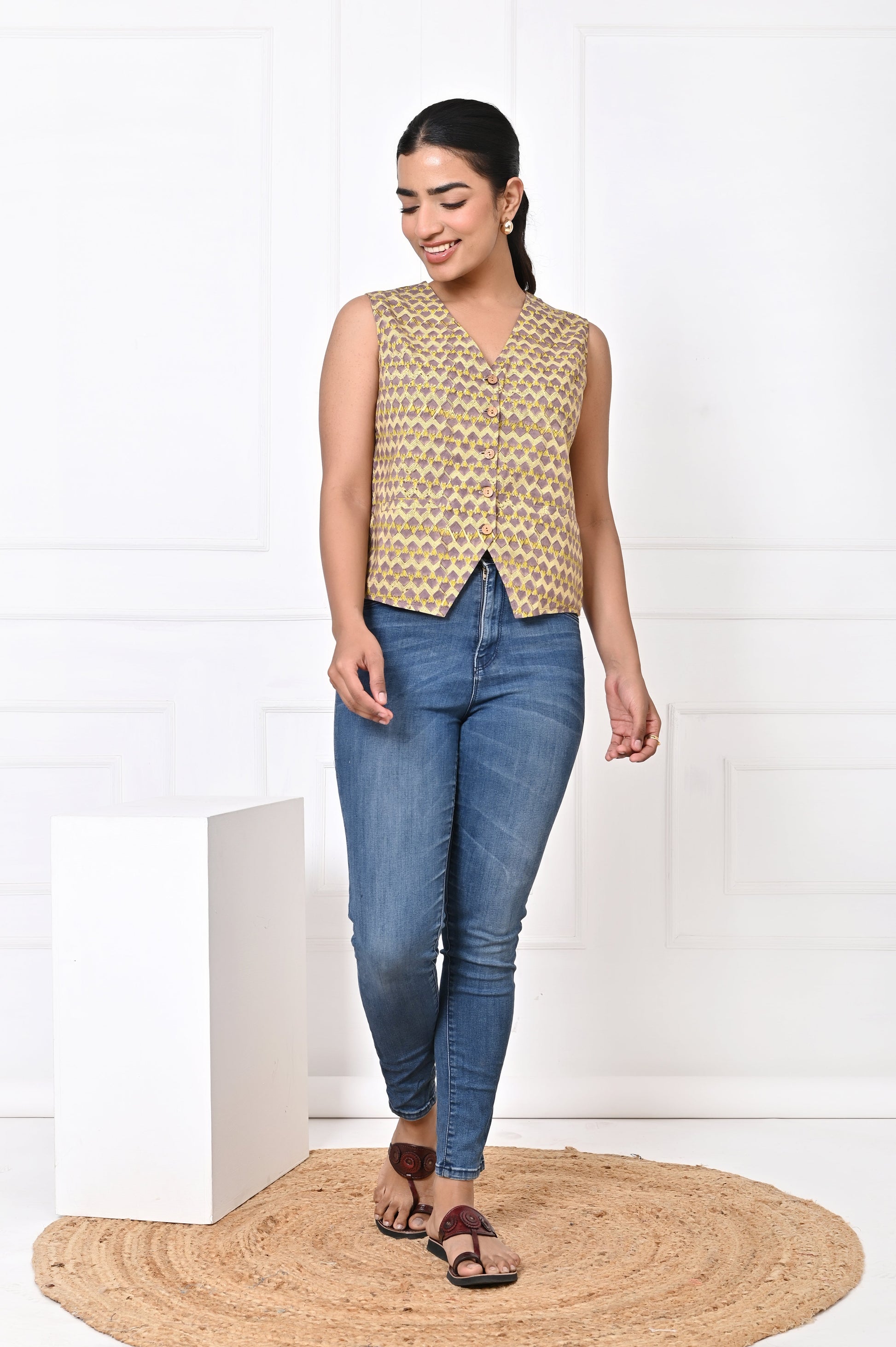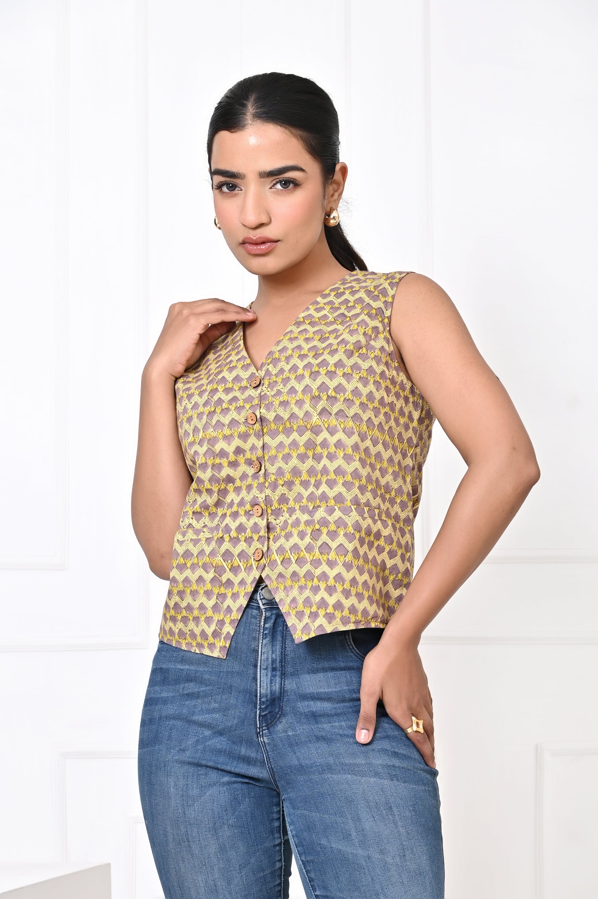 The beauty of the block-printed Koti lies in its adaptability. During the day, it can be paired with casual jeans or lightweight pants, creating a relaxed yet chic look perfect for lunch outings, casual gatherings, or workdays. For a more laid-back vibe, it can also be styled with shorts, adding an element of effortless cool while still maintaining elegance.