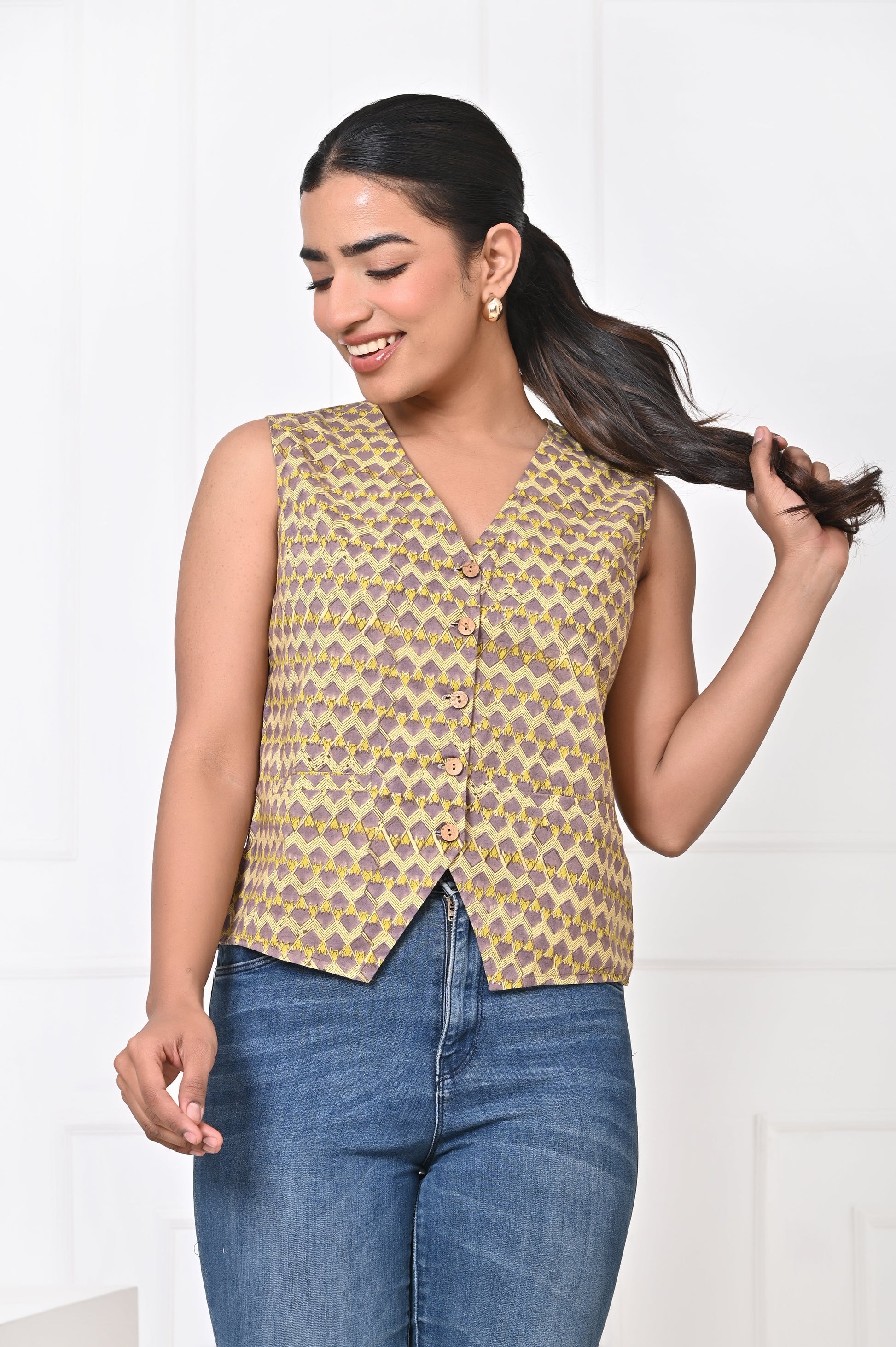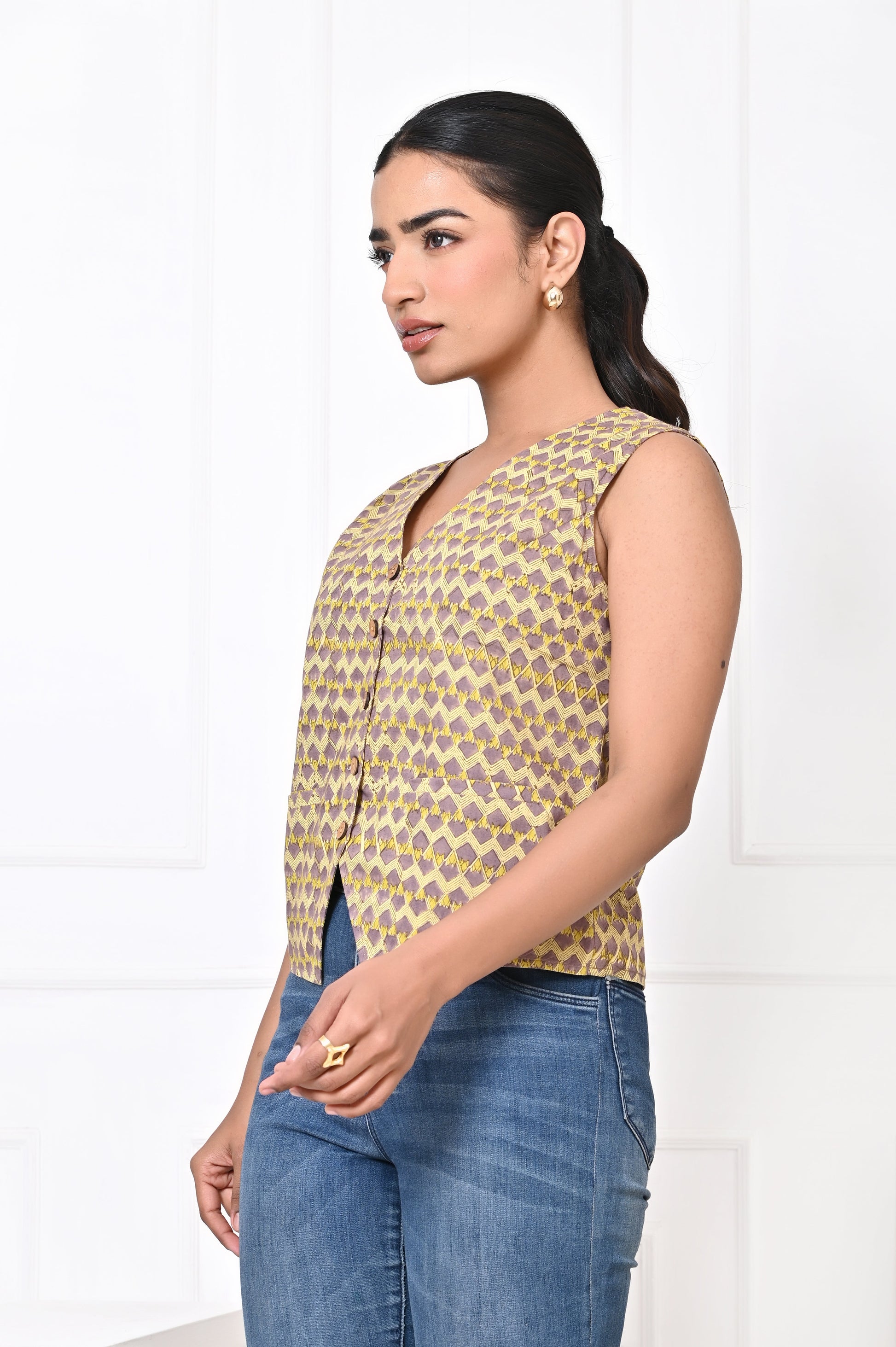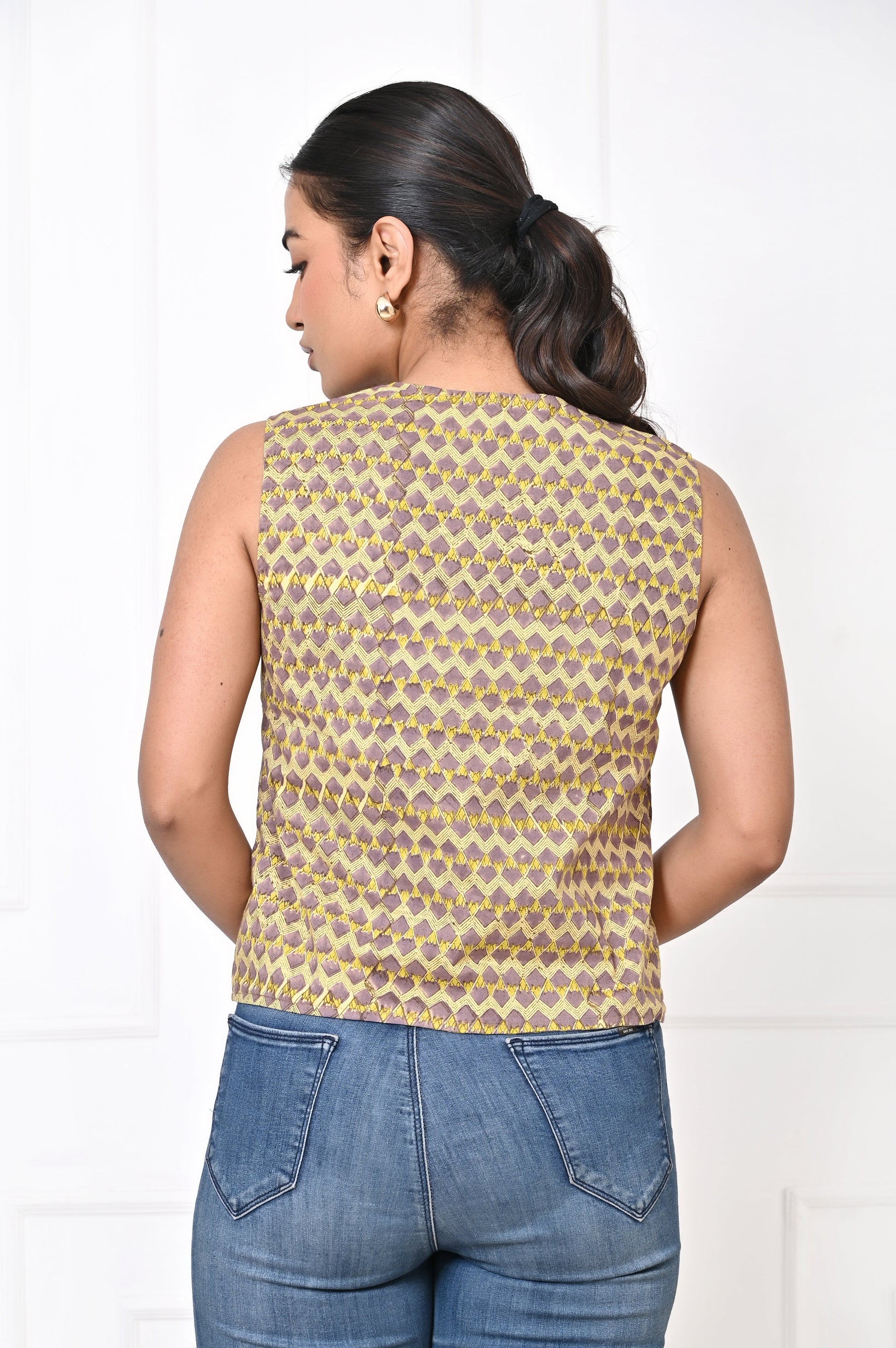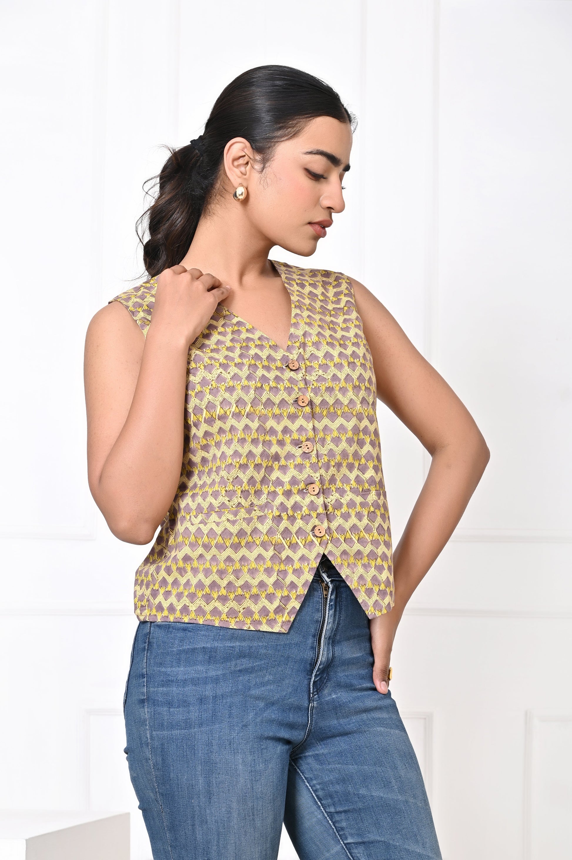 The beauty of the block-printed Koti lies in its adaptability. During the day, it can be paired with casual jeans or lightweight pants, creating a relaxed yet chic look perfect for lunch outings, casual gatherings, or workdays. For a more laid-back vibe, it can also be styled with shorts, adding an element of effortless cool while still maintaining elegance.