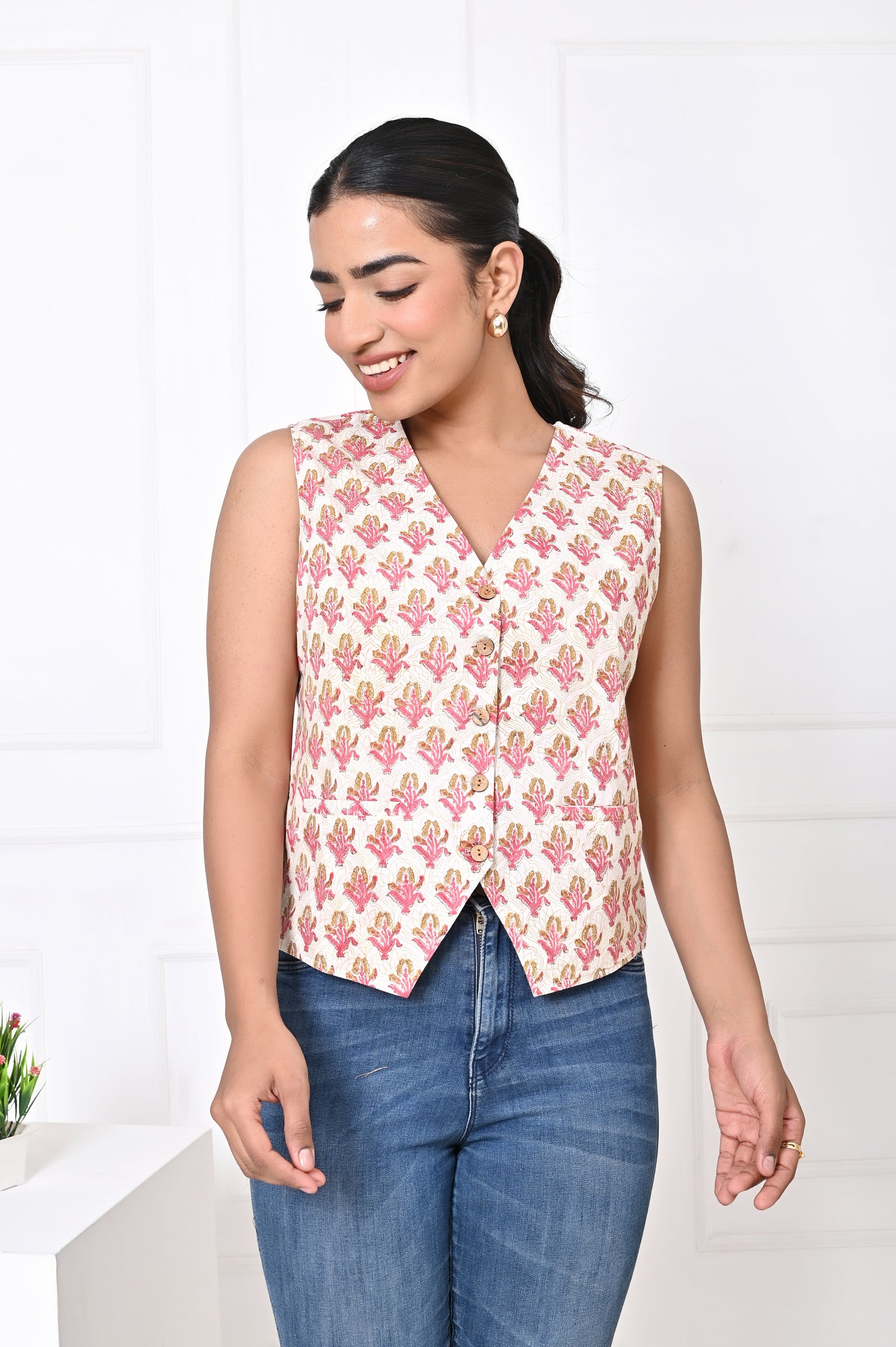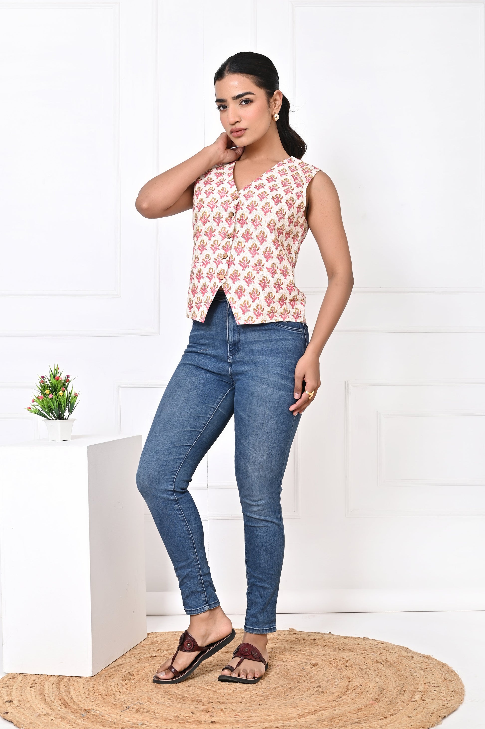 The beauty of the block-printed Koti lies in its adaptability. During the day, it can be paired with casual jeans or lightweight pants, creating a relaxed yet chic look perfect for lunch outings, casual gatherings, or workdays. For a more laid-back vibe, it can also be styled with shorts, adding an element of effortless cool while still maintaining elegance.