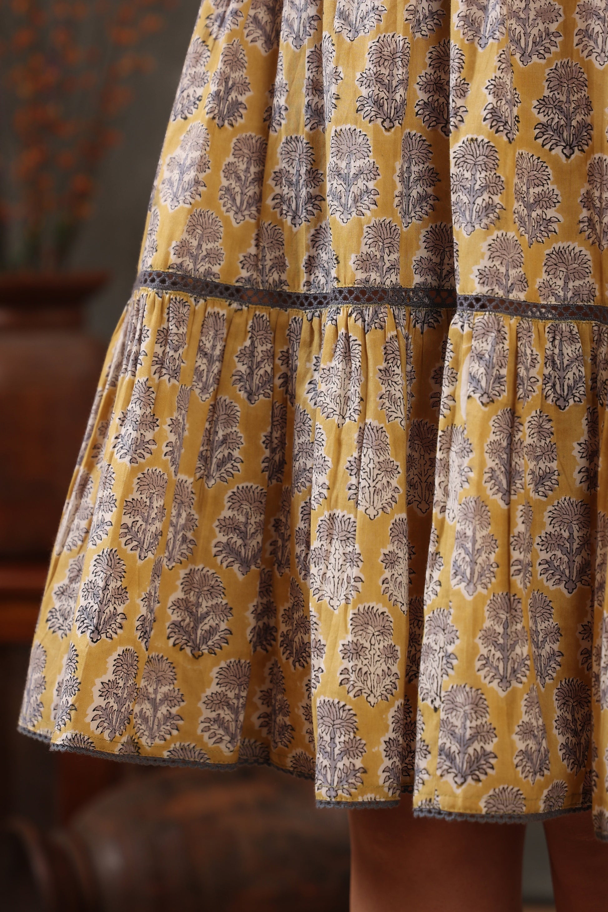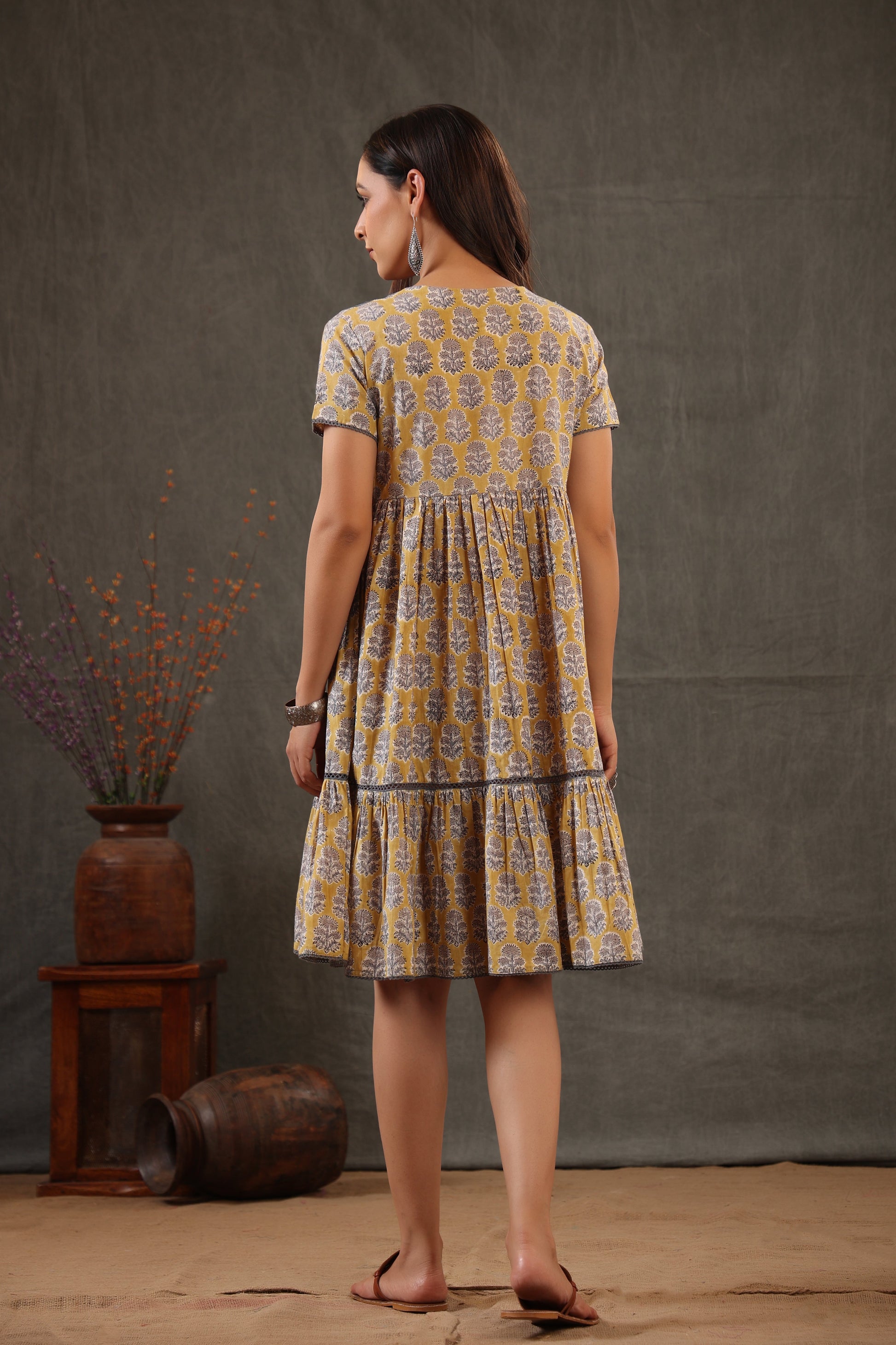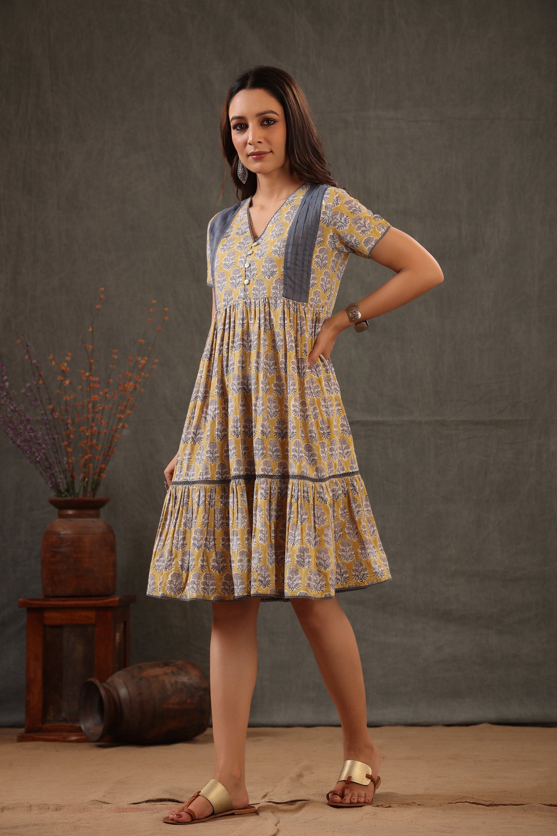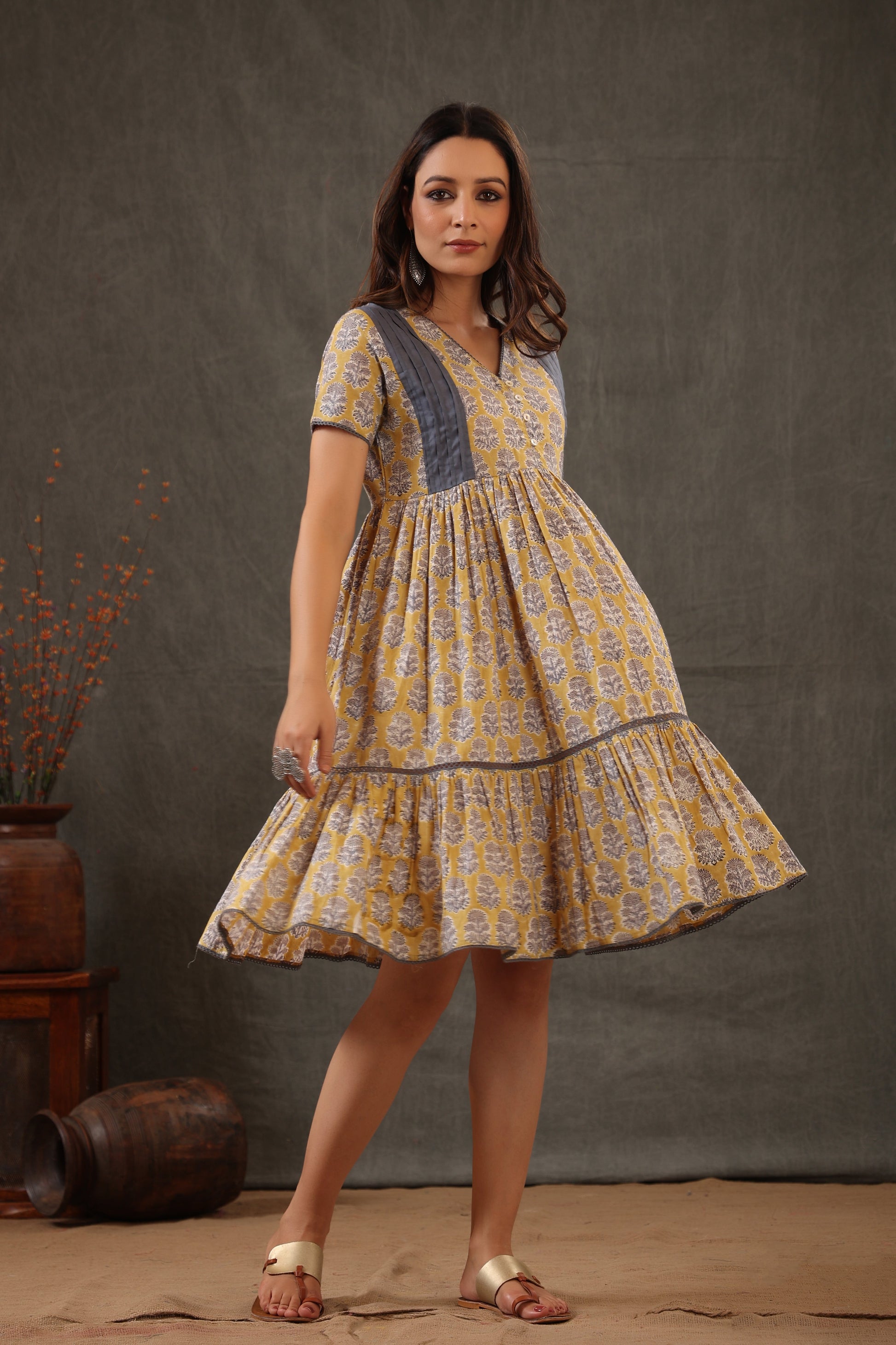 Our timeless floral button down dress comes with combination of yellow and stone gray made with soft cotton fabric for chic look.